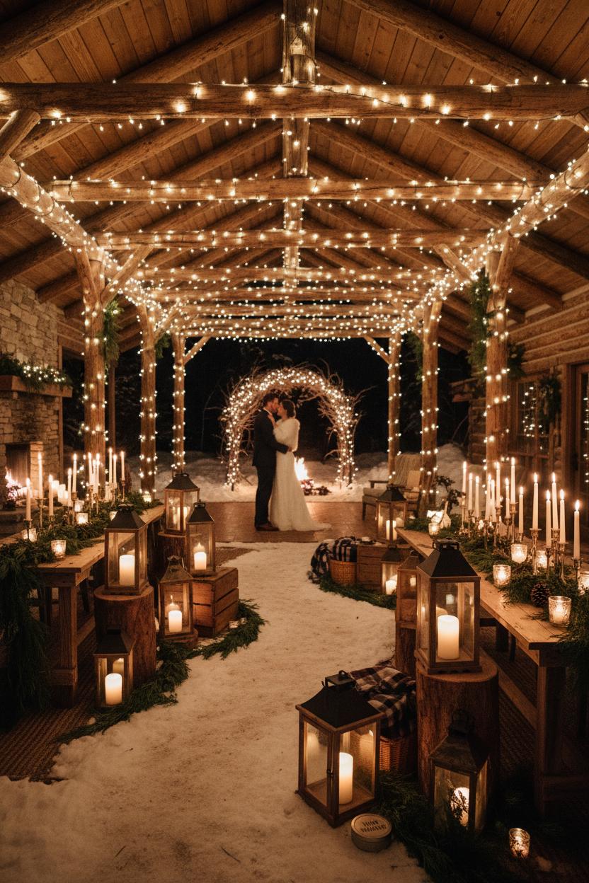 Lanterns are the heartbeat of rustic romance after dark. Mix weathered wood, black iron, and brushed brass lanterns to line the pathway from cabin door to ceremony nook, then cluster them on stump pedestals and vintage crates for that layered, lived-in look. Slip in flameless candles so the flame won’t fuss with winter breezes, and scatter petite tea lights in frosted or amber glass for an extra flicker. Pair baskets of plaid throw blankets near the lounge with little tins of hand warmers so guests can wander between the bonfire and bar without losing the feeling in their fingers—mountain wedding practicality meets glow-up charm. The whole scene becomes a treasure trove of rustic wedding ideas: light pooling on snowbanks, shadows dancing on log walls, and reflections shimmering off icy windowpanes.