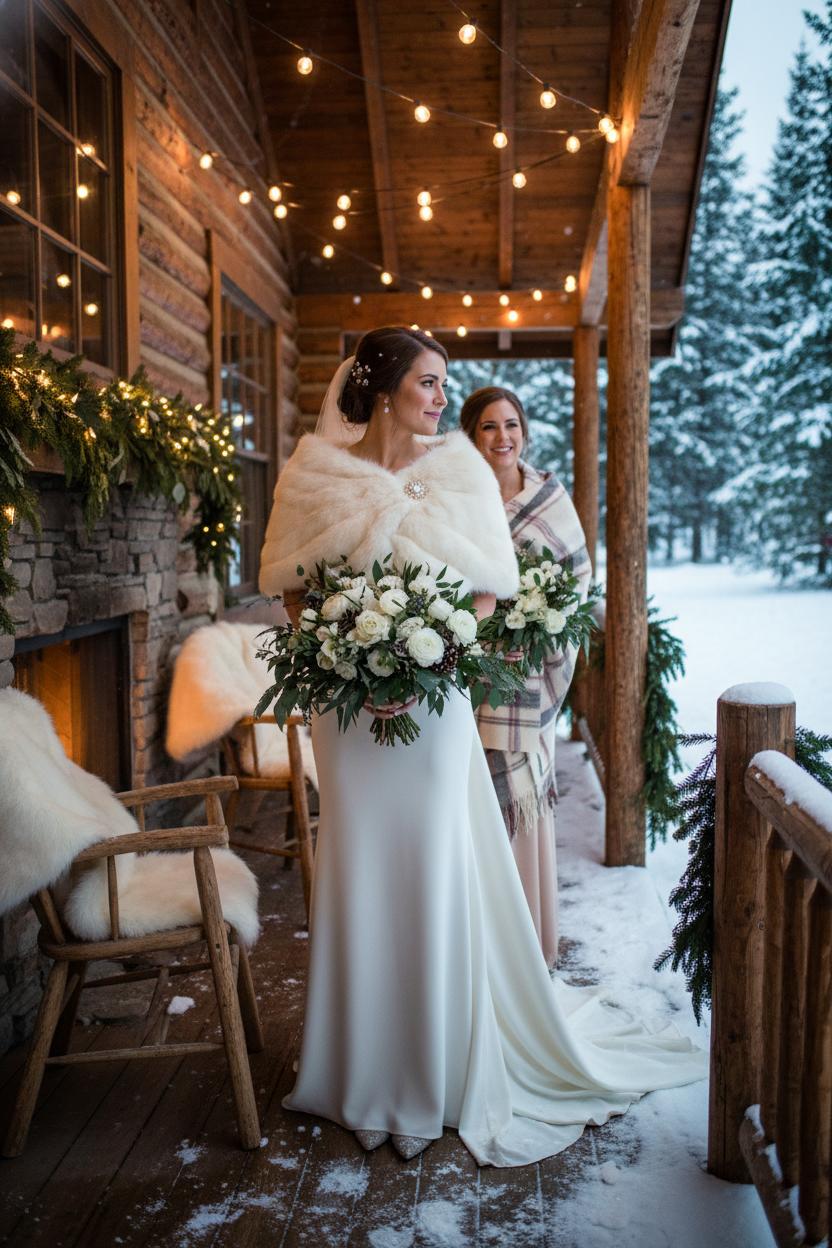 Styling-wise, balance is everything. A cropped wrap loves a sleek column dress and ankle boots dusted with snow; a longer stole drapes beautifully over a full skirt, especially with a velvet ribbon at the waist. Add pearl pins in a low chignon, a gauzy veil that peeks just beyond the fur’s edge, and a bouquet of pine, hellebore, and ranunculus. For bridesmaids, matching wraps or plaid throw blankets feel coordinated and cozy without being fussy—and they look adorable in group photos on the cabin steps. If you’re planning a cozy elopement, tuck discreet hand warmers into your pockets between portraits and let your photographer catch that natural rosy glow. As dusk falls, twinkle your way to the reception under strands of LED string lights and tuck greenery into banisters with strands of evergreen garland for that layered, rustic-luxe look.