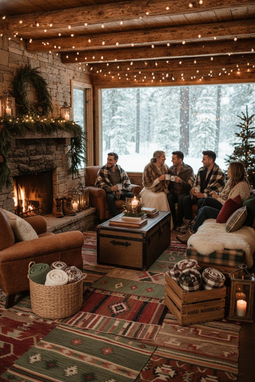 Picture your guests wandering into a tucked-away corner that feels like a secret living room in the woods: low-slung leather club chairs mingling with plaid-cushioned benches, vintage trunks doubling as coffee tables, and a layered patchwork of rugs underfoot—think woven kilims softened with sheepskin and wool for that sink-right-in warmth. Drape evergreen garland across a mantel or along cabin beams, then float a canopy of LED string lights overhead so the whole nook glows like fireflies caught in a winter evening. Stack baskets brimming with plaid throw blankets so everyone can wrap up between dances, and add lanterns and a few flickering candles for cozy, snow-kissed ambience that feels tailor-made for a winter cabin wedding. It’s the kind of mountain wedding moment where time slows down: friends sipping cocoa from enamel mugs, boots drying by the hearth, and laughter blending with the crackle of the fire.