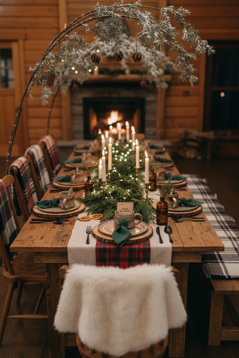 Round out the coziness by draping plaid throw blankets over chair backs and bench seats, and don’t be afraid to showcase a faux fur bridal wrap casually hung on the bride’s chair for a luxe, wintry touch. This look scales beautifully, whether it’s an intimate cozy elopement by the hearth or a long-table celebration in a timber hall. With mugs to warm hands, stoneware to ground the palette, and layers of wood, linen, and greenery, your tablescape becomes the heart of rustic romance—an effortless blend of comfort and style that guests will remember long after the last toast.