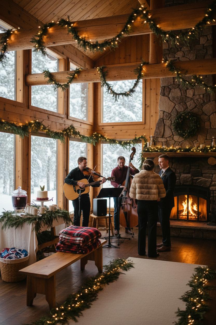 There’s something magical about the way music settles into the wood grain of a cabin. For a winter cabin wedding, think small-scale and soul-stirring: an acoustic guitarist, maybe a fiddle or a stand-up bass, playing stripped-down versions of your favorite songs as snow hushes the world outside. Imagine walking down an aisle lined with evergreen garland while a gentle fingerpicked melody drifts through the room, then sharing a fireside first dance with flames crackling and your faux fur bridal wrap catching the glow. Keep it cozy by stringing warm LED string lights across the rafters and over the mantel, letting the twinkle echo each chord. Acoustic sets feel like a heart-to-heart with your guests, and they fit seamlessly into rustic wedding ideas—think folksy covers during cocktail hour, a sweet, slow waltz after dinner, and a singalong nightcap by the hearth. If you’re planning a mountain wedding where the altitude sharpens the air, that intimate, unplugged vibe is the soundtrack you’ll want in your memories.