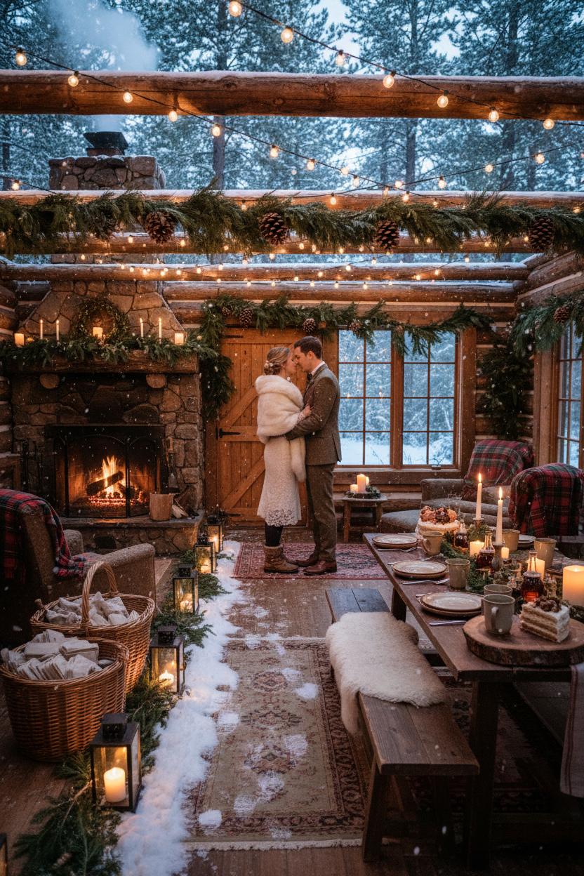 Imagine arriving just as the first blue light of morning lifts over the pines, smoke curling from the chimney and snowflakes drifting like confetti—this is the soul of a winter cabin wedding. The path to the door is lined with lanterns and dusted evergreens, the crunch of snow under boots giving way to the hush of a cozy, firelit room. Overhead, LED string lights glow like a constellation, while an evergreen garland spills across beams and mantle, perfuming the air with cedar and spruce. Benches and armchairs are layered with plaid throw blankets, and baskets of hand warmers wait by the door for rosy-cheeked guests coming in from the cold. It’s the kind of scene where you feel wrapped in warmth before you even take off your coat—pure snowy wedding inspiration and the heart of rustic wedding ideas brought to life in a tucked-away mountain wedding hideaway.
