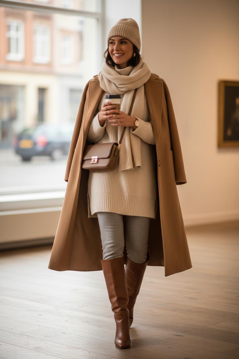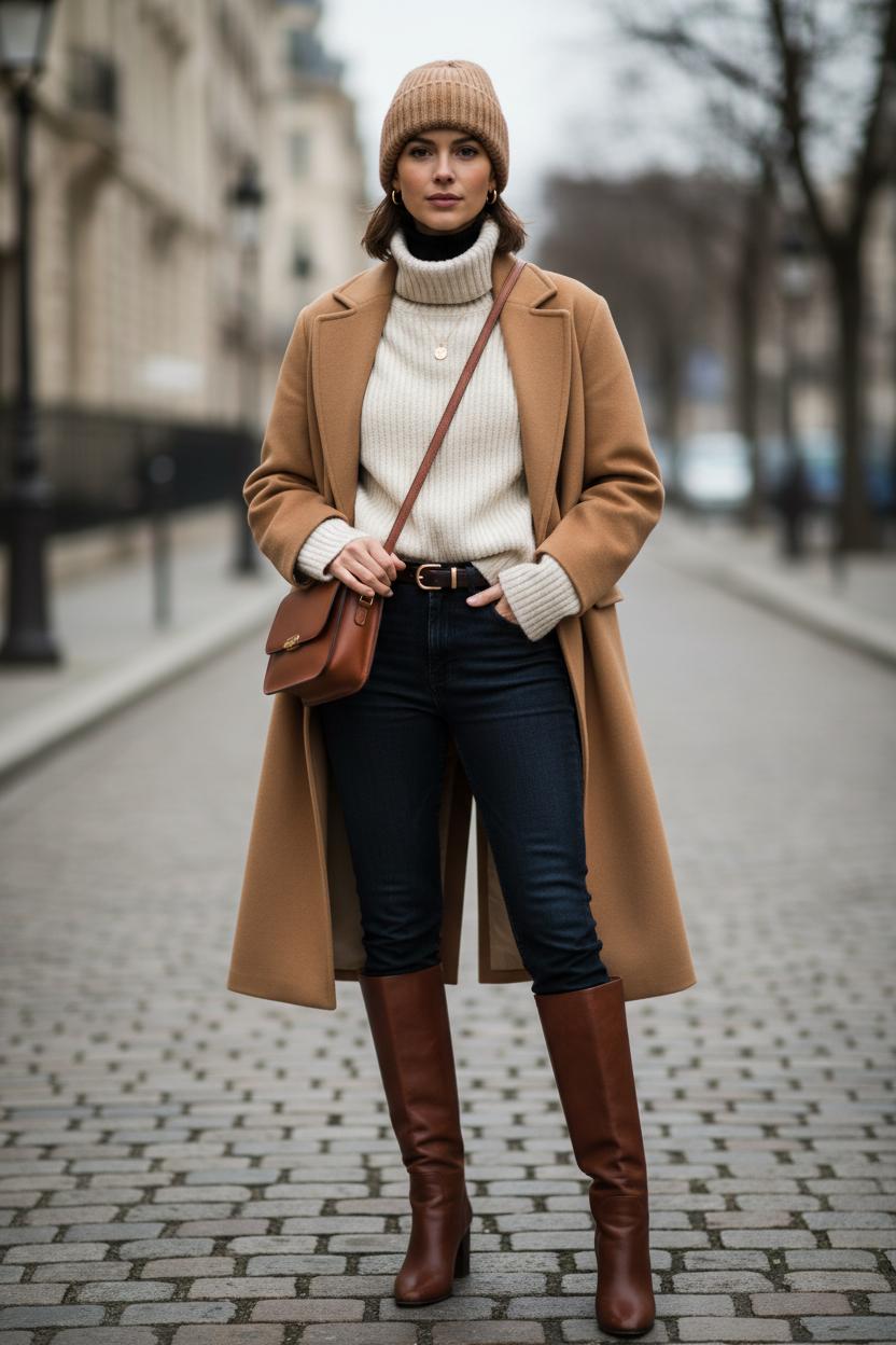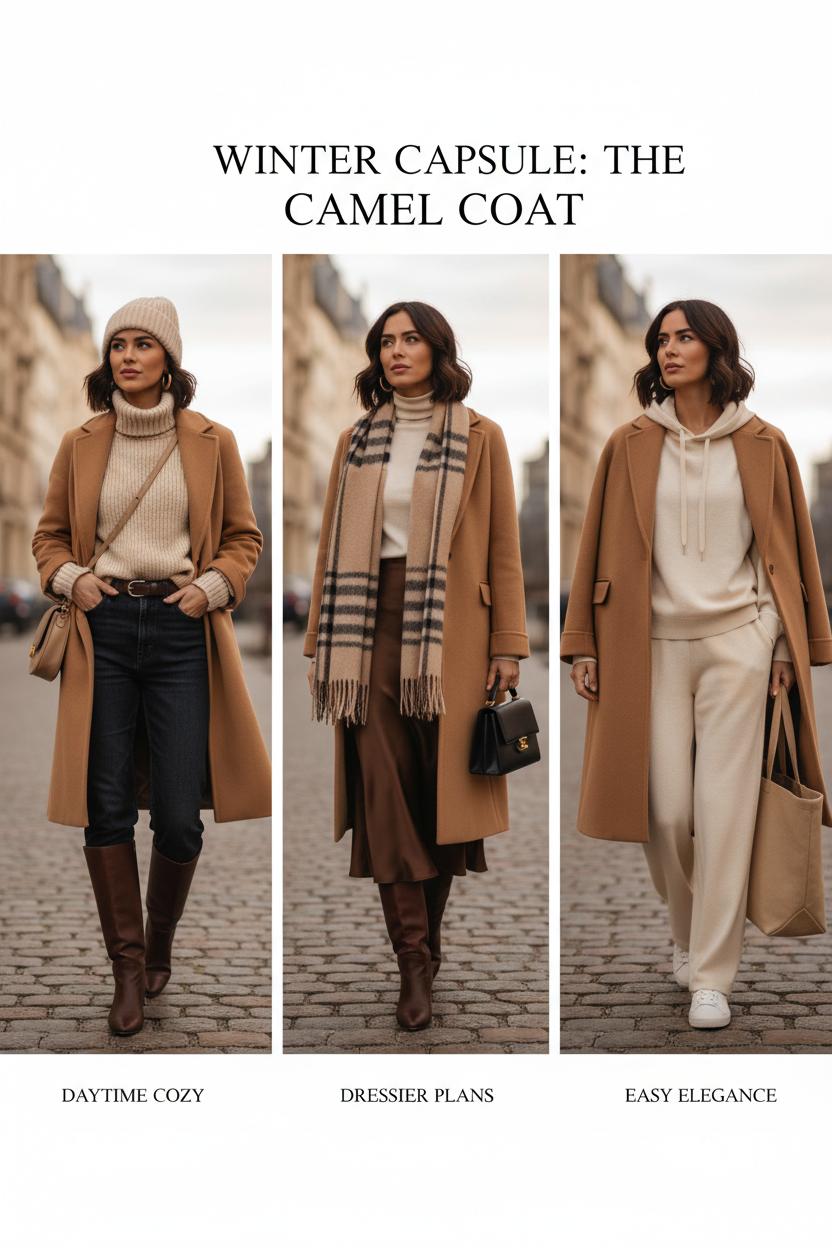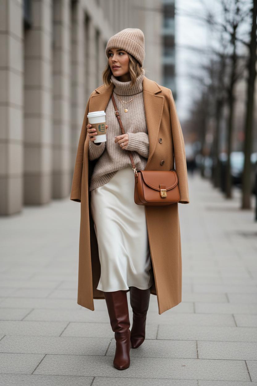 For dressier plans, swap denim for a satin midi or knit column skirt, add sheer tights, and keep the knee high leather boots. A fine-gauge turtleneck or silky blouse balances the coat’s coziness with polish. If you love monochrome, build shades of camel and cream; if you prefer contrast, let the coat soften an all-black look. A big scarf tucked into the lapels reads editorial and extra warm. The beauty here is ease: the right camel coat slips over gym sets, office staples, and date-night dresses, making winter outfits feel styled in seconds. With a few quality pieces—your coat, a couple of knits, boots, and a hardworking bag—you’ve got a capsule wardrobe winter collection that’s practical, pretty, and Pinterest-perfect.