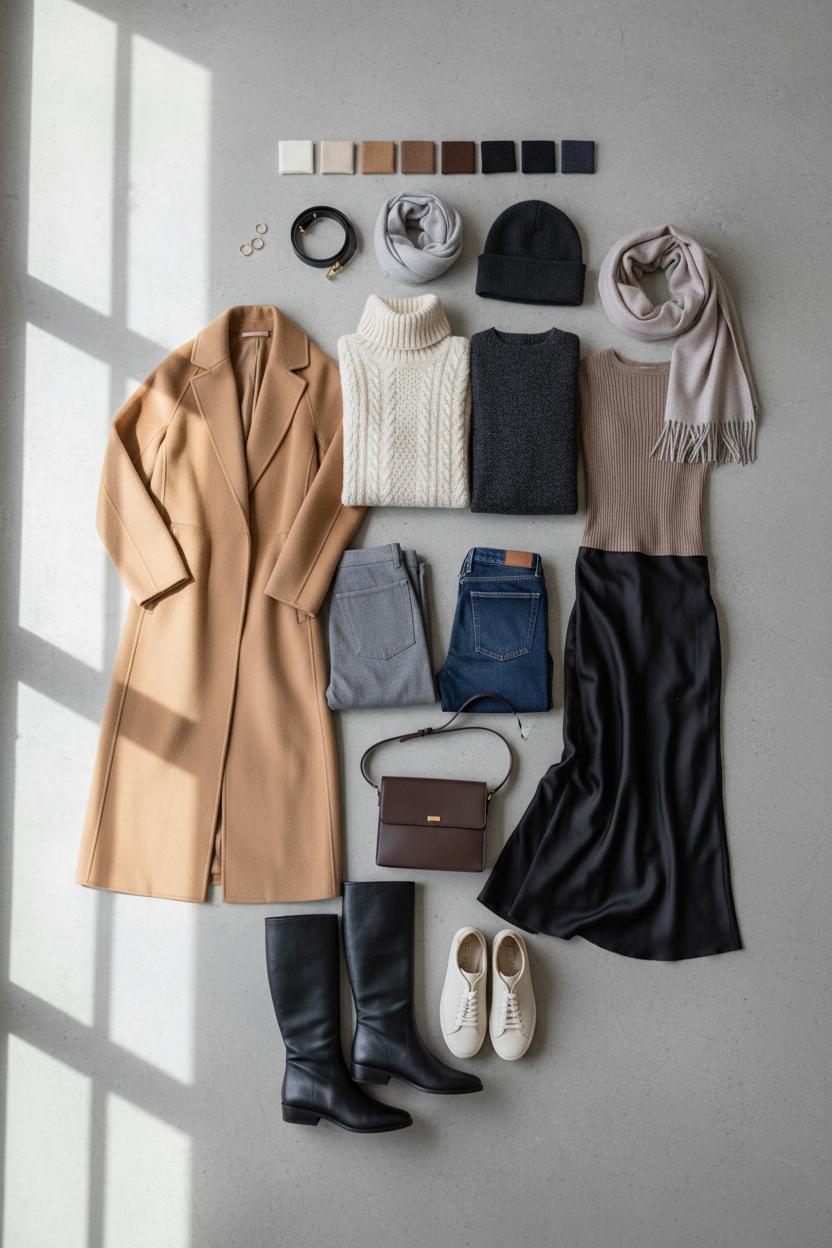 Start with the outerwear hero: a camel coat women reach for year after year. Underneath, rotate a chunky turtleneck sweater, a fine-gauge merino crew, and a ribbed knit dress for cozy knitwear that feels luxe, not bulky. Add tailored charcoal trousers, dark denim, and a satin slip skirt to shift from errands to dinner without changing your palette. Finish with knee high leather boots for sleek lines, a minimalist sneaker for off-duty days, and a crossbody bag leather that hugs close under your coat. Top it all off with a wool beanie women love for warmth and that cute, slightly slouchy finish. A simple belt, delicate hoops, and a cashmere scarf in oat or gray round out the set without stealing the show.