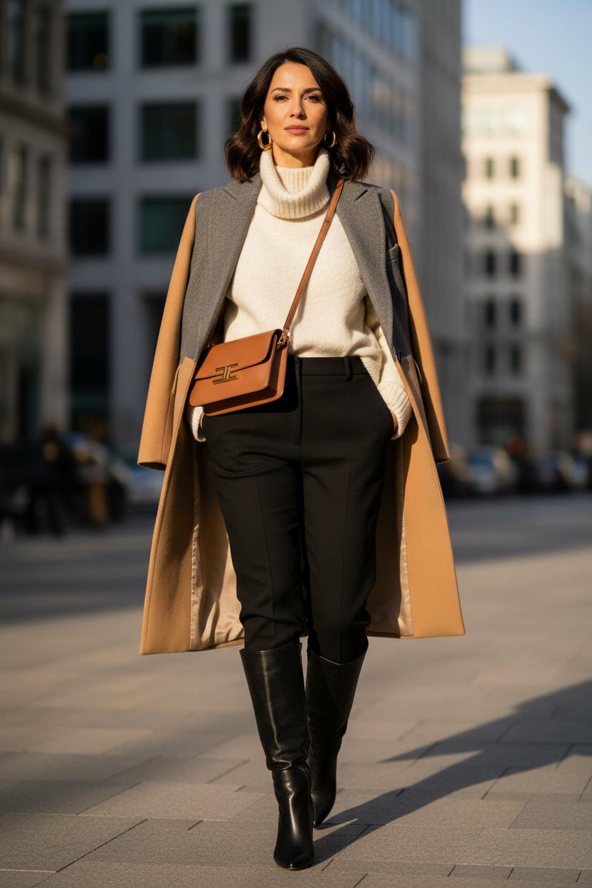 For styling, think mindful layers that play with proportion and tone. My go-to layering tips: keep the base slim (thermal tee, fine-knit leggings or trousers), then add volume with the knit and structure with the coat. Create a long line with a column of color—cream on cream or charcoal on charcoal—and let your outer layer be a gentle contrast. Knee high leather boots ground everything with a modern edge, while a compact crossbody bag leather piece keeps the silhouette clean and hands-free. If you’re building a capsule wardrobe winter edit, focus on a tight lineup: the camel coat, that wear-everywhere chunky turtleneck sweater, tailored trousers, a mid-length slip or sweater skirt, and boots that work from day to dinner. Keep metals warm (brushed gold hoops, a delicate watch) and repeat tones across your look so each piece feels related. The result is a quietly chic rotation you can remix all season—no overthinking, just elevated neutrals layered to perfection.