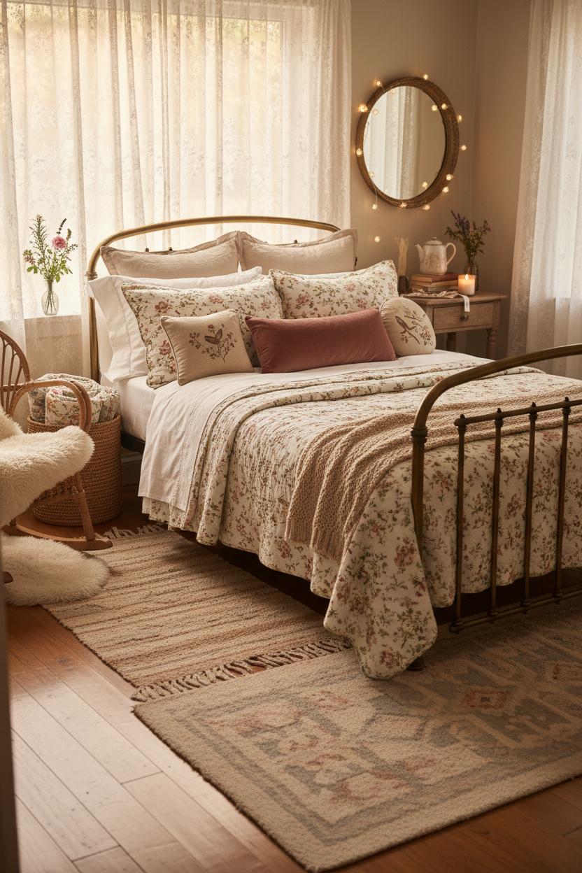 Start from the ground up: in a cottagecore bedroom, rugs are the whisper that softens every step. Layer a plush wool or tufted cotton rug beneath a brass bed frame so your toes meet something cloud-soft every morning, then add a braided jute runner or a faded rag rug at the edges for that storybook mix of textures. Patterns can be gentle—petite stripes, ditsy florals, or a timeworn kilim that looks like it’s been loved for decades—perfect for a vintage bedroom vibe. Keep the palette hushed and herbal: moss, tea rose, oat milk, and cream. When sunlight filters through lace curtains, those subtle tones glow, and the whole room feels like a meadow at golden hour. Tie the bed together with a floral quilt set and a crisp sheet stack; the quilt’s prints can echo the rug’s colors so everything looks gathered, not overly matched. If you’re working with a wood floor, let a round braided rug peek out under the wood nightstand and tuck a sheepskin by your window to anchor your reading spot.
