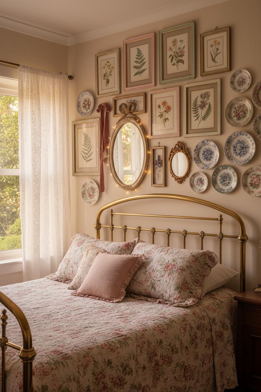 Vintage Bedroom Wall Decor: Botanical Prints, Mirrors, and Plates