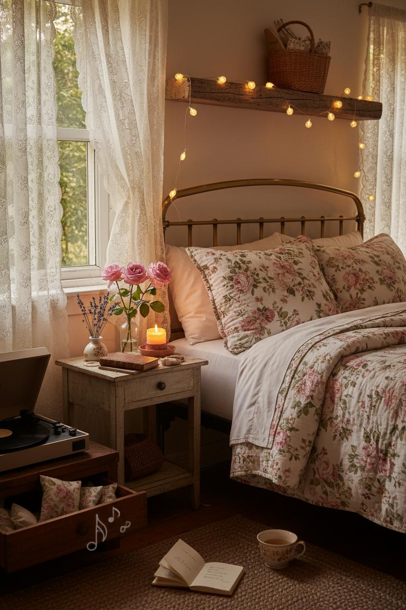 Make evening a ceremony. Draw the curtains, flick on those fairy string lights, and smooth the floral quilt set across your brass bed frame like the final brushstroke on a painting. Set a cup of chamomile or rose tea on the wood nightstand, jot three lines of gratitude, then massage a little hand cream and spritz your pillow with your linen mist. Slip into bed, phone tucked away, a single page of poetry or a well-loved novel waiting. These tiny touchstones turn cottage core decor into lived-in love—cozy room ideas that become habits, and habits that become the heartbeat of a sanctuary you can’t wait to come home to.