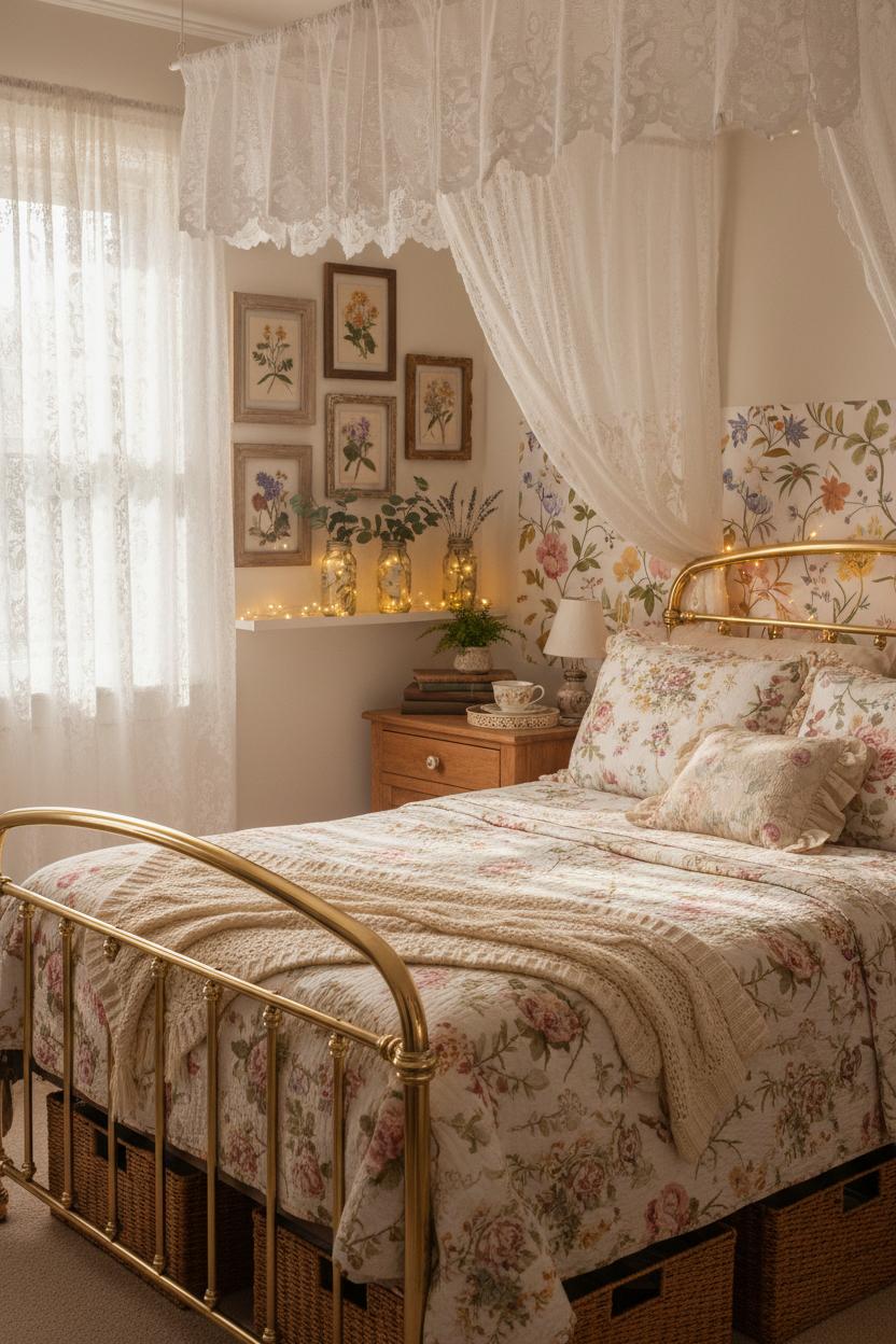 If your walls could whisper, they’d beg for botanical prints. Start by gathering a mix of vintage-style wildflower illustrations, fern studies, and delicate herbarium pages, then frame them in a blend of antique gold, weathered wood, and hand-painted pastels to keep things collected rather than matchy. Hang them salon-style above the brass bed frame, letting the edges drift slightly irregular for that lived-in cottagecore bedroom charm. Choose a palette that ties back to your bedding—a soft rose-and-sage floral quilt set pairs beautifully with meadowy prints—and let lace curtains diffuse the light so the artwork glows at golden hour. This is cottage core decor at its dreamiest: romantic and nostalgic, but grounded by natural textures and a storybook sense of calm.