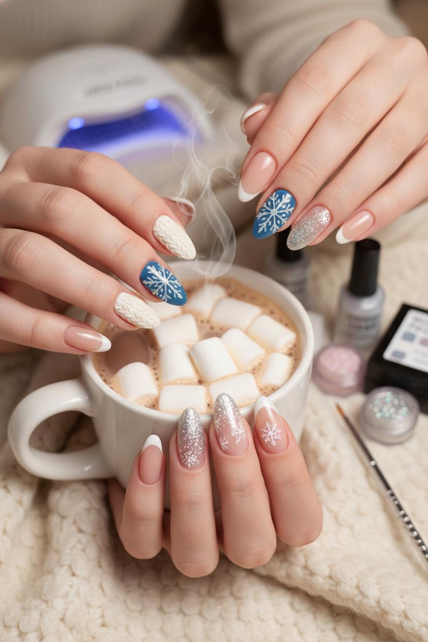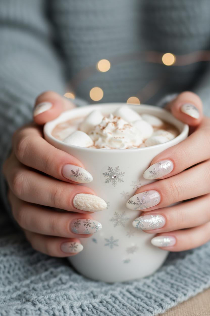 If you’re dreaming up snowflake nails, start with the timeless looks and then let the details make them feel fresh. A sheer milky base with delicate white flakes feels soft and airy, while a baby-blue ombré sprinkled with fine glitter gives that frosty, just-stepped-out-into-the-snow vibe. Go classic with a French tip and add a single silver-studded flake on the ring finger, or lean into the “glazed” trend with a pearly topper that makes every flurry shimmer. Short squovals look chic with petite flakes placed off-center, and almond shapes are so flattering for daintier linework. If you love texture, pair one or two sweater nails—those cozy, cable-knit accents in matte white—with glossy snowflake accents on the rest for the ultimate cozy manicure that still feels polished and modern. These are the kind of cute winter nails you’ll keep screenshotting: simple, frosty, and endlessly wearable.