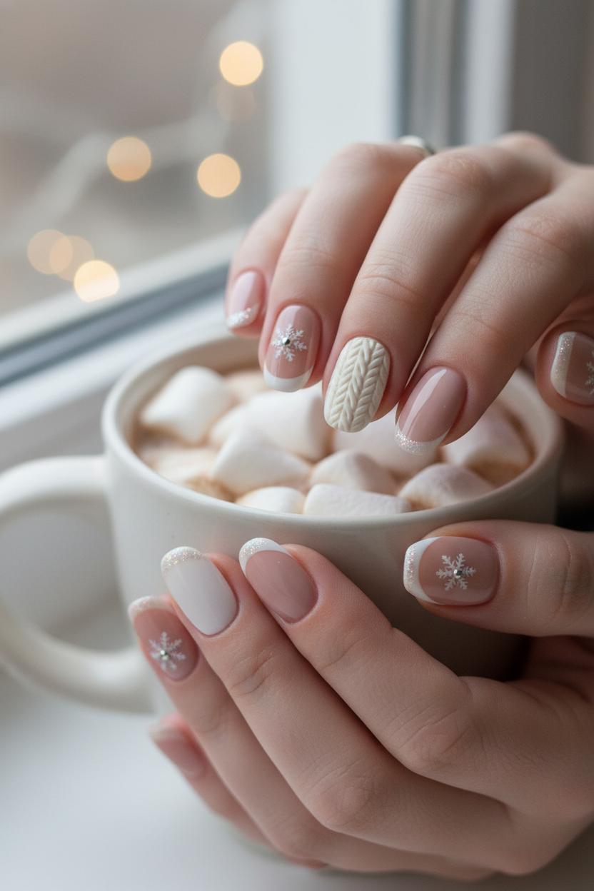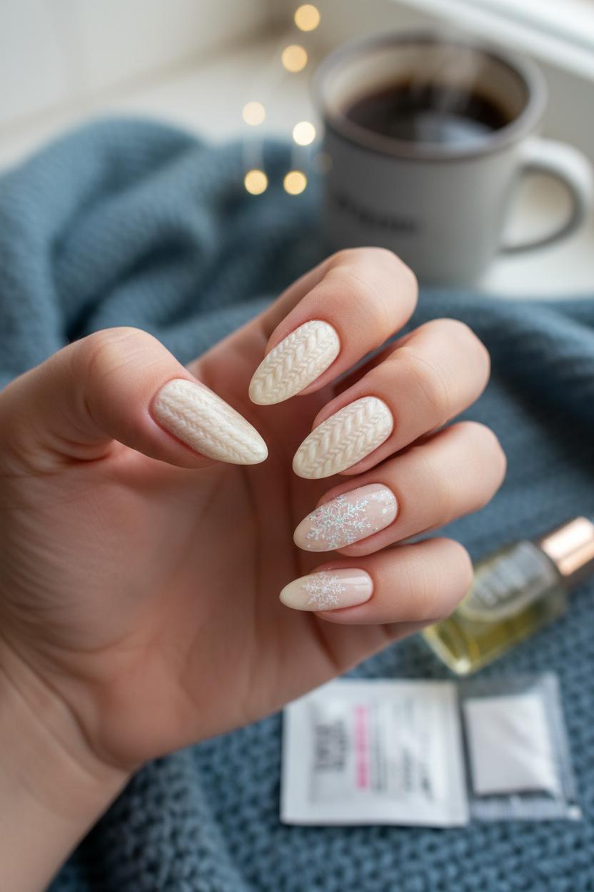 Want to try sweater nails for that cable-knit moment? Use the same base shade, then mix a bit of color gel with clear to thicken slightly. With a thin brush, sketch raised “knit” lines—cables, dots, and dashes—down the nail; cure, then repeat to build texture. For the fluffiest effect, dust a little clear acrylic powder over the pattern before curing, or keep it glossy and seal with a no-wipe gel top coat. Leave your textured nails matte and keep the snowflake nails shiny for a cozy contrast that looks boutique-level, even under a blanket. Finish with cuticle oil, snap a photo by the window, and enjoy the glow: an at-home, cocoa-approved set that proves the sweetest cute winter nails are the ones you make yourself.