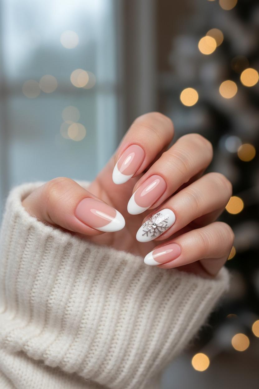 If your day-to-day calls for polish that looks elegant at 9 a.m. meetings and still feels festive for hot cocoa runs, short and oval snowflake nails are the sweet spot. The soft oval silhouette elongates the fingers without the fuss, and the shorter length makes these cute winter nails practical for typing, texting, and pulling on mittens. Try a palette of milky cream, latte beige, or sheer blush as your base—those cozy, sweater-weather shades make a subtle backdrop for delicate flakes. A micro-French in soft white with a single snowflake accent feels fresh, while dove gray with a whisper of shimmer reads wintry without screaming holiday. Think of it as a cozy manicure that blends style and comfort, like your favorite knit paired with a great coat.