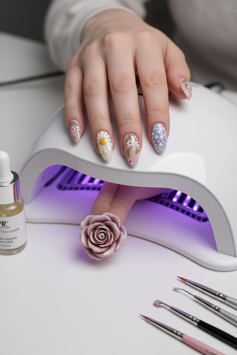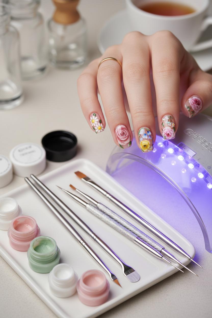 For staying power and that glossy, fresh-picked finish, cure as you go under a UV LED nail lamp. Flash-curing thin layers helps lock in each stroke so your petals don’t smudge while you add leaves or line work, and it’s especially helpful for daisy nails where those white dots need to stay super round. If you’re craving rose nail art with softly curled edges, cure your base petals first, then layer a touch of translucent color for depth, sealing each step. Not in the mood to freehand? Tuck floral nail stickers into your kit—press them onto a smooth, cured surface and frame them with a few painted leaves for a custom-meets-effortless vibe. Finish your spring manicure with a glossy or soft-touch top coat to protect your bouquet and bring out the dimension. A little care—thin layers, clean tools, and patient curing—goes a long way, and with the right brushes, dotters, gels, and lamp, your fingertips will look like a tiny garden in bloom.