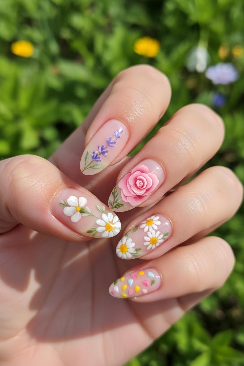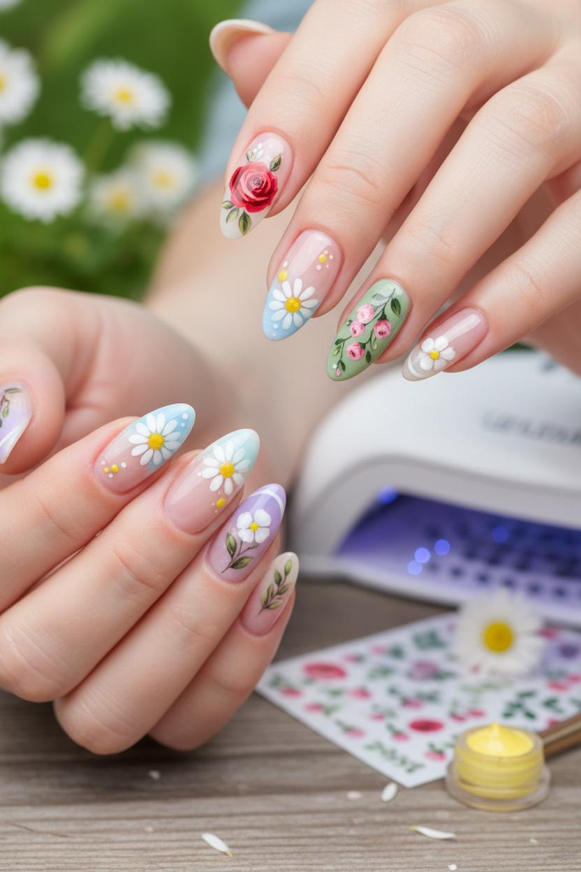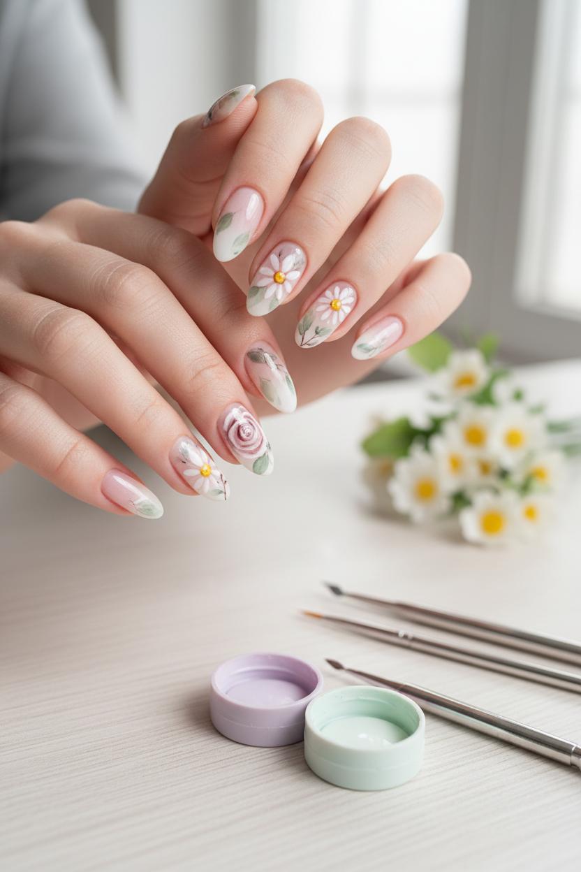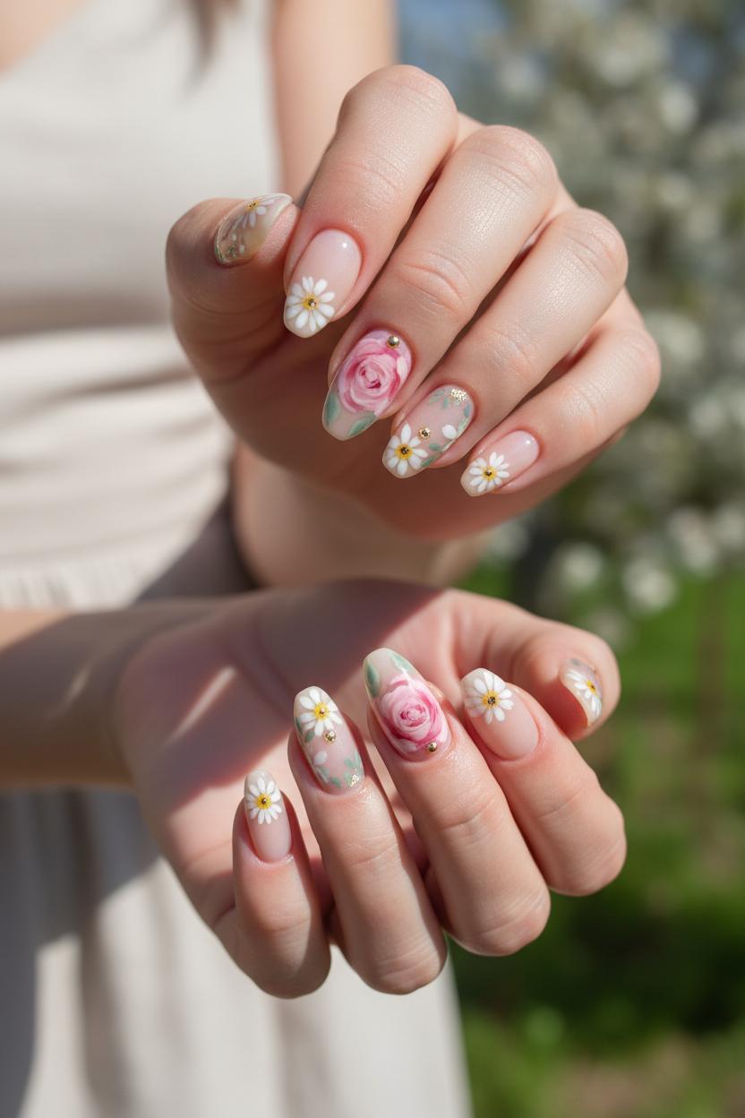 Little extras make these flower nail designs sing: a dot of micro-glitter in daisy centers, a tiny gold stud at the base of the rose, or a velvet matte top coat to give your floral nail art that soft, petal-like finish. However you style it, the mix-and-match approach keeps daisy nails playful while letting rose nail art add that romantic whisper—perfect for ushering in spring.