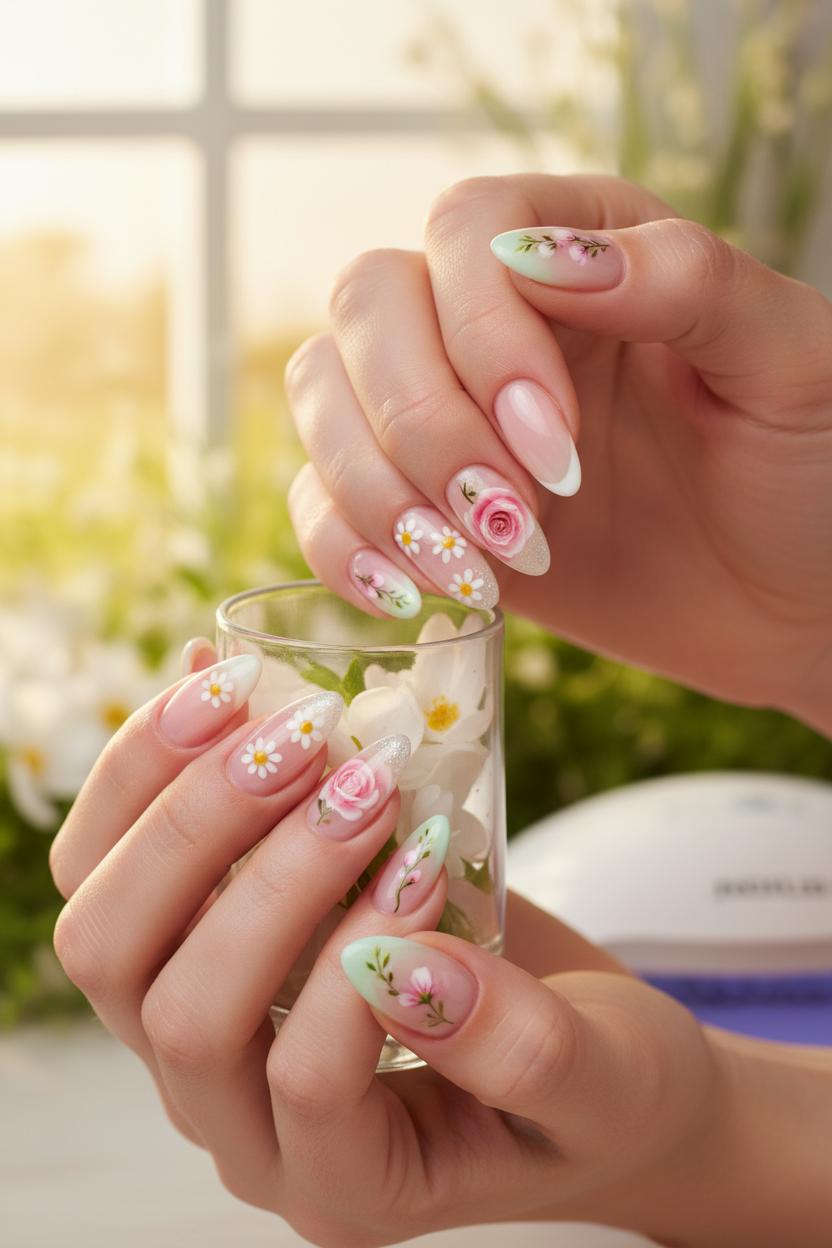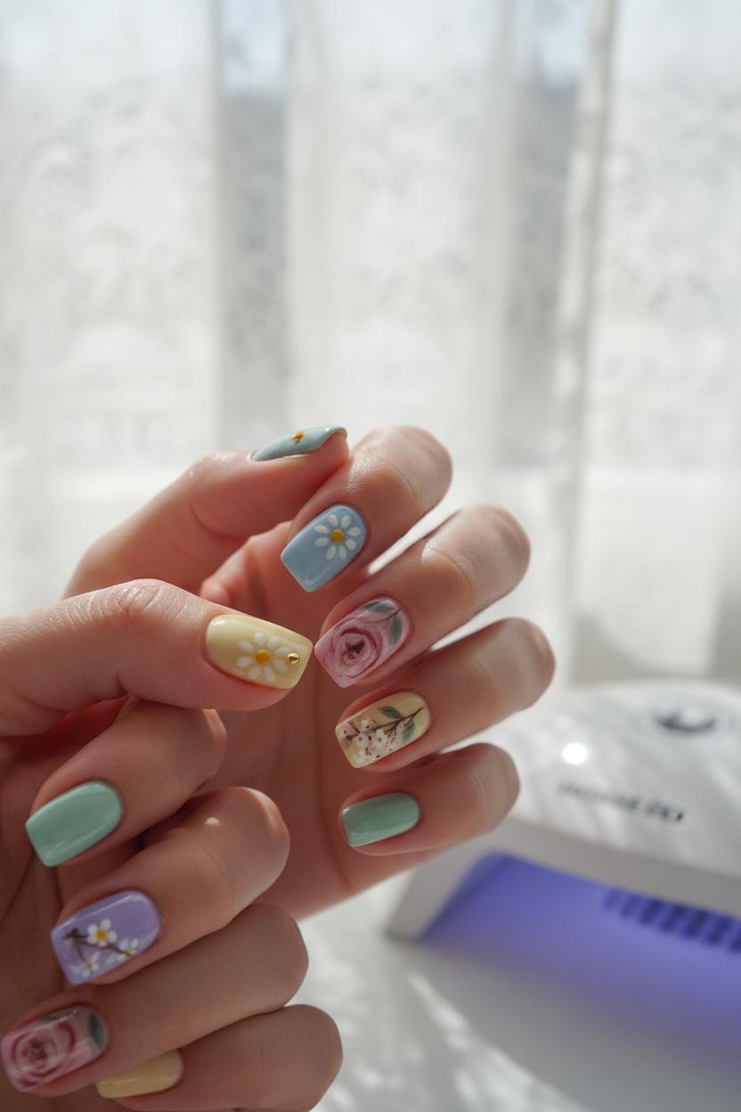 Think of pastels as the soft-focus filter for your fingertips—the dreamy backdrop that lets every petal and leaf sing. Start by shopping your gel polish set for a palette of whispery shades: buttercream yellow, powdery blue, marshmallow pink, mint milkshake, and a lavender haze. Prep with a careful base coat, then float on two thin, even layers of your chosen color, curing between coats under a UV LED nail lamp for that glassy, cushiony finish that makes a spring manicure feel extra fresh. Mix and match across both hands, or keep it tonal—five versions of pink is a mood—then decide where you want your florals to bloom. Pastels instantly soften the look of your fingertips and make even the tiniest blossoms pop without ever feeling busy.