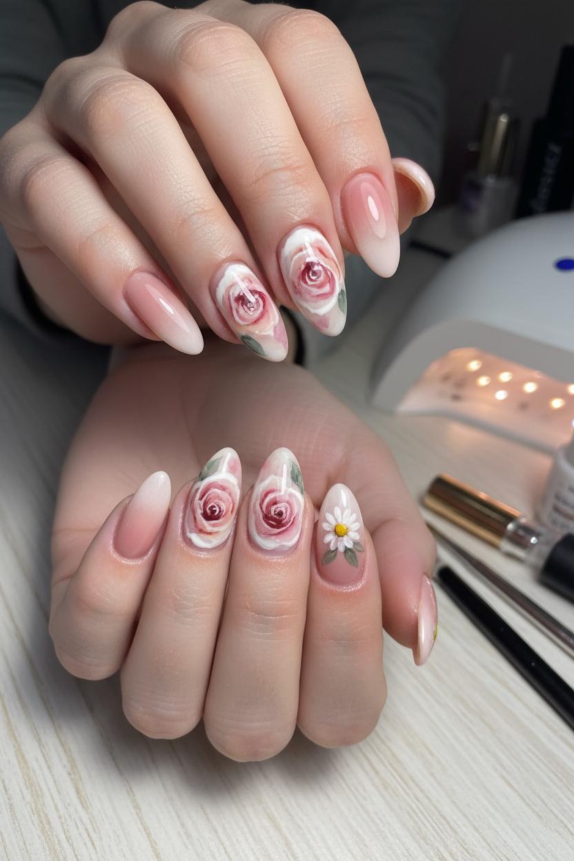 For extra softness, try a blush-to-nude ombré on a couple of nails and place a single, slightly off-center bloom so it looks like it landed there naturally. A micro-French in petal pink is a chic partner to fuller flowers, and a single leaf in muted sage keeps the palette grounded. Want a little sparkle? Kiss the center of one rose with the faintest tap of rose-gold foil, then seal everything with a high-shine top coat so the petals look dewy. If you’re working with a gel polish set, cure each delicate layer under a UV LED nail lamp as you go to preserve that gossamer softness. Dotting tools are great for creating tiny rosebuds, and you can even sneak in a single daisy accent—daisy nails next to roses feel like a wildflower moment and still read as refined.