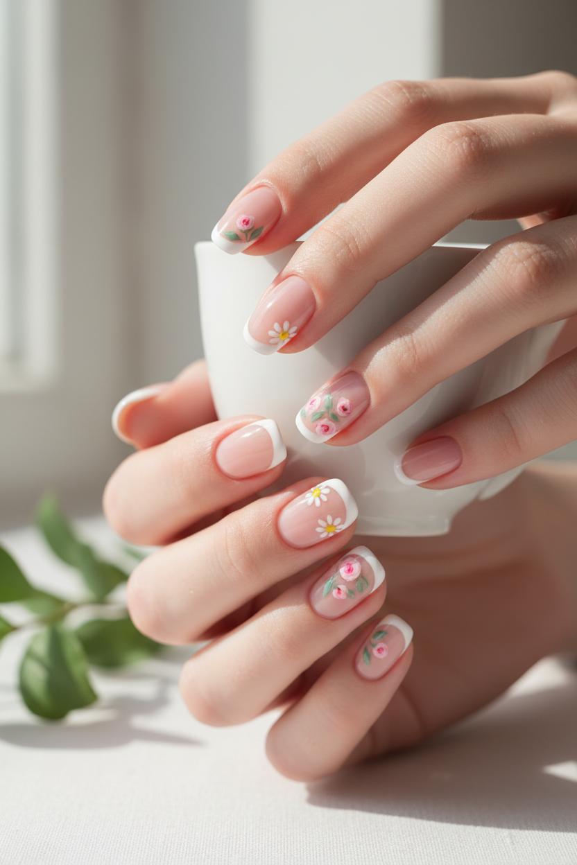 DIY-ing? A gel polish set with a sheer nude, soft white, petal pink, and leafy green keeps the palette cohesive. Lay down two thin coats of your sheer shade, curing each under a UV LED nail lamp. Sketch your French tip, then reach for fine nail art brushes to paint petals; use dotting tools for perfect daisy centers and micro-buds. For extra precision (or if freehand isn’t your thing), press on floral nail stickers just along the smile line and seal them in—no one will know. Try variations: cluster blossoms on one side for an asymmetrical tip, layer a double French with a delicate vine between, or give just the ring fingers a rosebud accent while the rest wear clean tips. A single gold micro-stud or a glint of foil at each flower center adds that Pinterest-pretty sparkle without taking over. Finish with a glossy top coat for glassy depth, or go soft-touch matte for a petal-like finish. Either way, these floral French tips are the kind of quiet, detailed beauty that makes your hands look instantly groomed, proof that a few thoughtfully placed flowers can transform a staple French into something sweet, chic, and completely spring.
