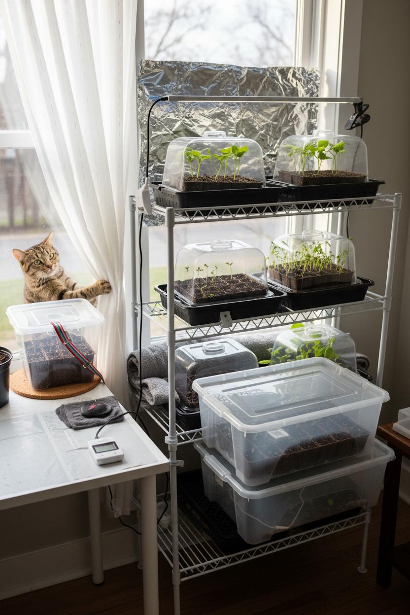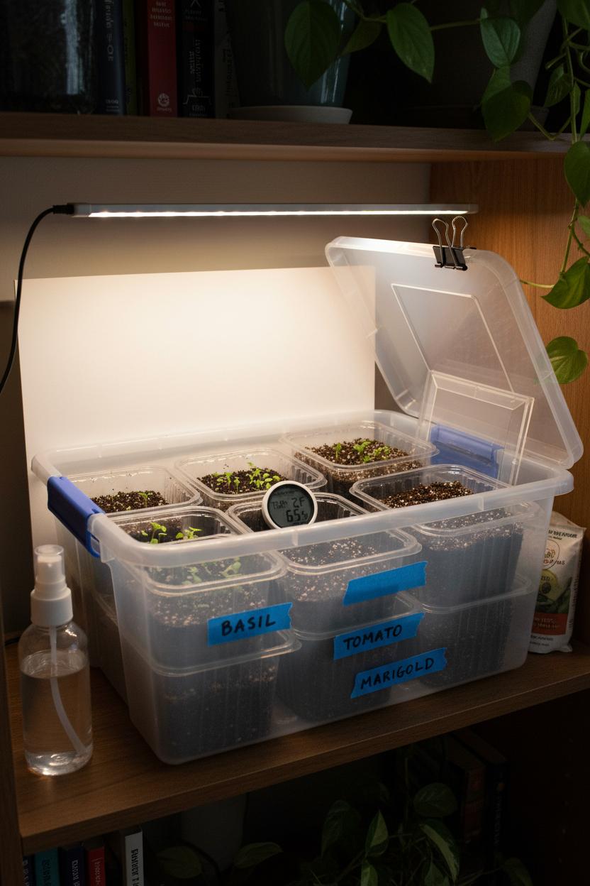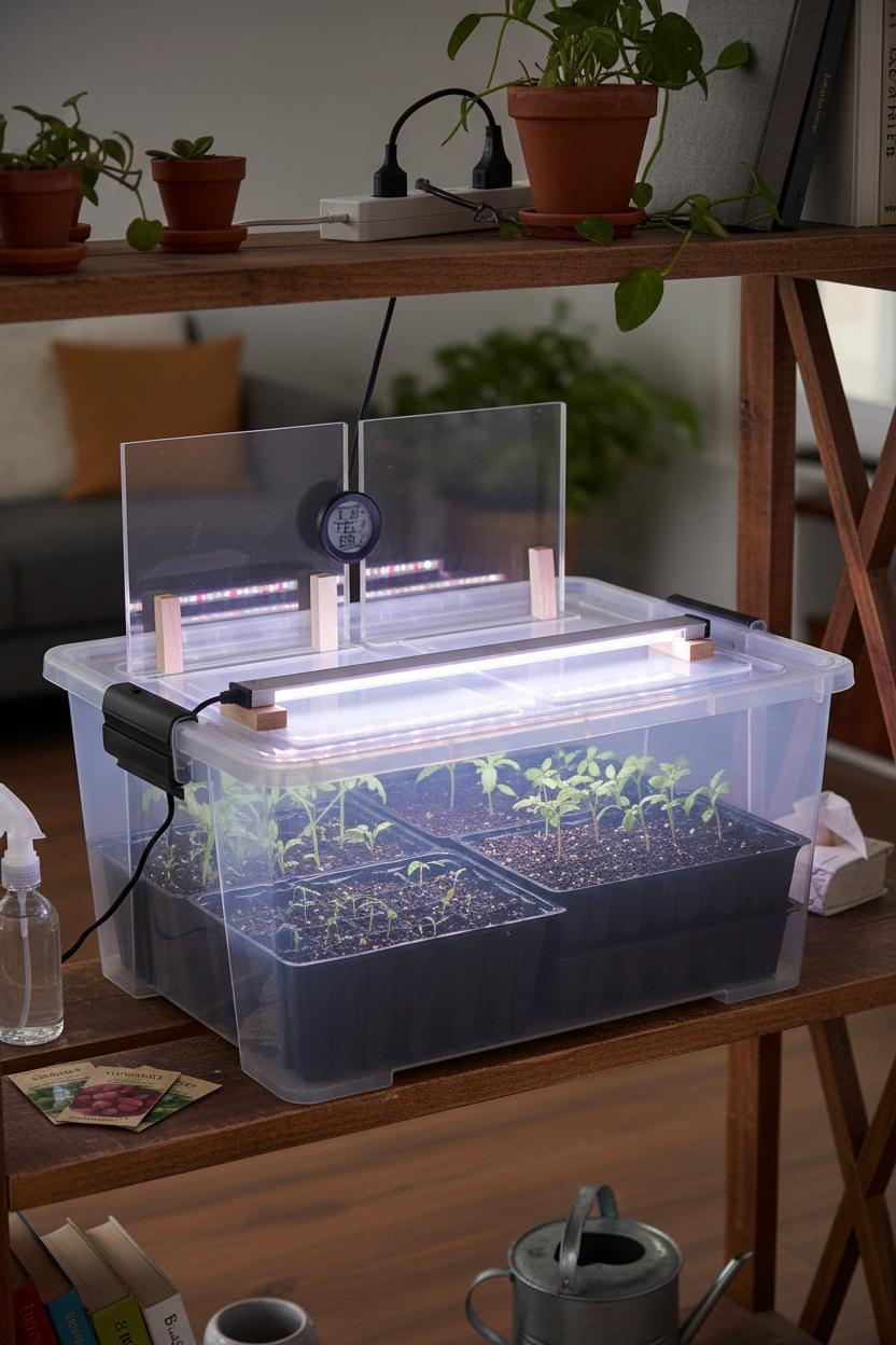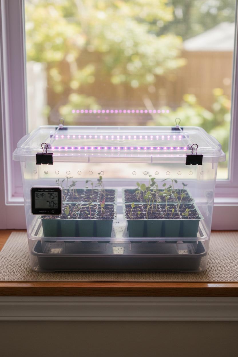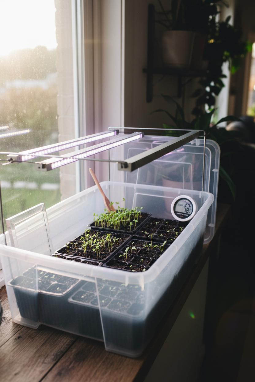 Finally, LED grow lights are the finishing touch. Slim bar-style lights or a compact panel can sit on the bin lid or hang just above it, bathing your seedlings in bright, even light without heating things up. A simple outlet timer keeps the routine steady—about 14–16 hours a day for strong, stocky growth. With a clear storage bin, a few acrylic picture frames, seed starter trays, a mini hygrometer, and LED grow lights, you’ve got a tidy, portable indoor greenhouse that tucks onto a bookshelf or countertop and turns even the tiniest corner into a thriving, green, budget-friendly seed starting station.