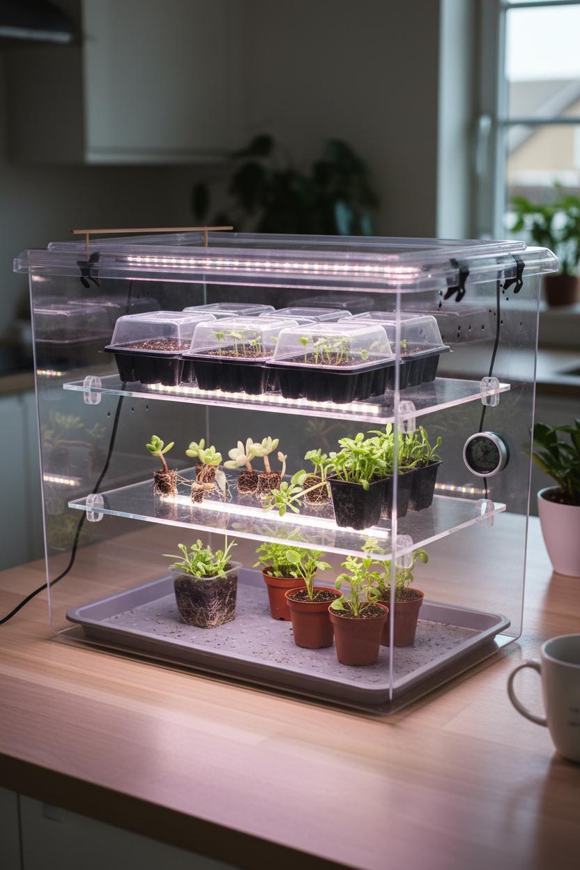 On the practical side, compact setups are easier to manage, too. Seed starting likes consistency: even moisture, bright light, and good air. Slide a couple of seed starter trays inside your bin or frame, and everything stays tidy and contained on a shelf or countertop. I love using acrylic picture frames as clear “walls” or a hinged lid—they’re lightweight, affordable, and wipe clean in a second. A mini hygrometer tucked inside helps you check humidity at a glance, so you can crack the lid or prop it open with a wooden spoon when it creeps too high. Pair your tray with LED grow lights positioned just above the seedlings, and you’ll avoid leggy stems without needing a south-facing window. Because the footprint is small, it’s less intimidating to water, rotate, and check on daily—little rituals that make a big difference.