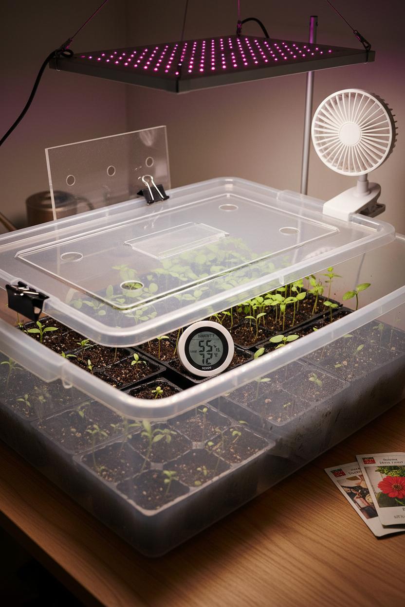 Sowing is simple once you know the rule of thumb: plant seeds about two times as deep as they are wide. Tiny, light-lovers such as lettuce or snapdragon can be sprinkled on the surface and just pressed in with a fingertip; a whisper-thin dusting of vermiculite helps keep moisture even. Label everything right away—you’ll thank yourself later. Slide your trays back into the bin, snap on the lid, and you’ve got a quick indoor greenhouse. A mini hygrometer tucked inside makes it easy to keep tabs on humidity and temperature at a glance; you’re aiming for warm and comfortably humid, not a rainforest. If condensation is heavy, crack the lid to prevent damping-off.