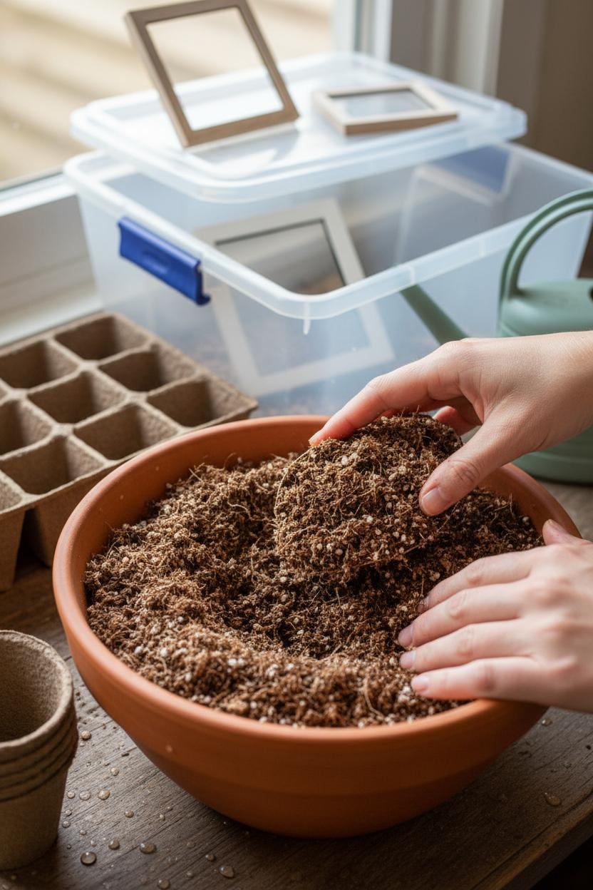 Think of your soil as the cozy bedding that helps tiny roots feel brave. For seed starting, skip heavy garden dirt and choose a sterile seed starting mix or a light blend of coco coir, perlite, and a pinch of compost. Pre-moisten it until it’s the texture of a wrung-out sponge—damp, not drippy—and gently fill your seed starter trays, tapping the sides to settle without packing it down. If you’re doing this as a mini greenhouse diy in a small space, set the trays inside a clear storage bin to create that humid, stable “indoor greenhouse” vibe on a shelf or windowsill. I like propping the lid slightly with acrylic picture frames so air can move while humidity stays cozy. It’s a total budget garden project that looks tidy and works like a charm.