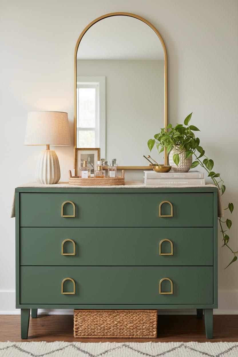Because this was a true thrift flip and not a showroom piece, I leaned into contrast to tell the story of the furniture makeover. The silky paint surface makes natural textures pop, so I layered in a woven tray to corral perfume and rings, a linen runner to break up the expanse of color, and a ribbed ceramic lamp for quiet dimension. If your DIY furniture project skews moody, pull in warm metals and a smoky glass vessel; if it’s light and airy, let clear glass and pale woods echo the freshness. Keep your palette to three core tones: the dresser color, your metal (those brass drawer pulls are timeless), and one accent pulled from art or textiles. Edit, then edit again—negative space feels luxe. Slide a lidded basket underneath for seasonal throws, and prop a tiny frame against the mirror for that layered, collected vibe. A spritz of linen spray and a low, grounding rug complete the scene. In minutes, the piece goes from “nice paint job” to “where did you get that?” And that’s the magic of a thoughtful dresser makeover: your thrift flip reads custom, your room feels elevated, and you get a daily reminder that style doesn’t have to be spendy to look stunning.