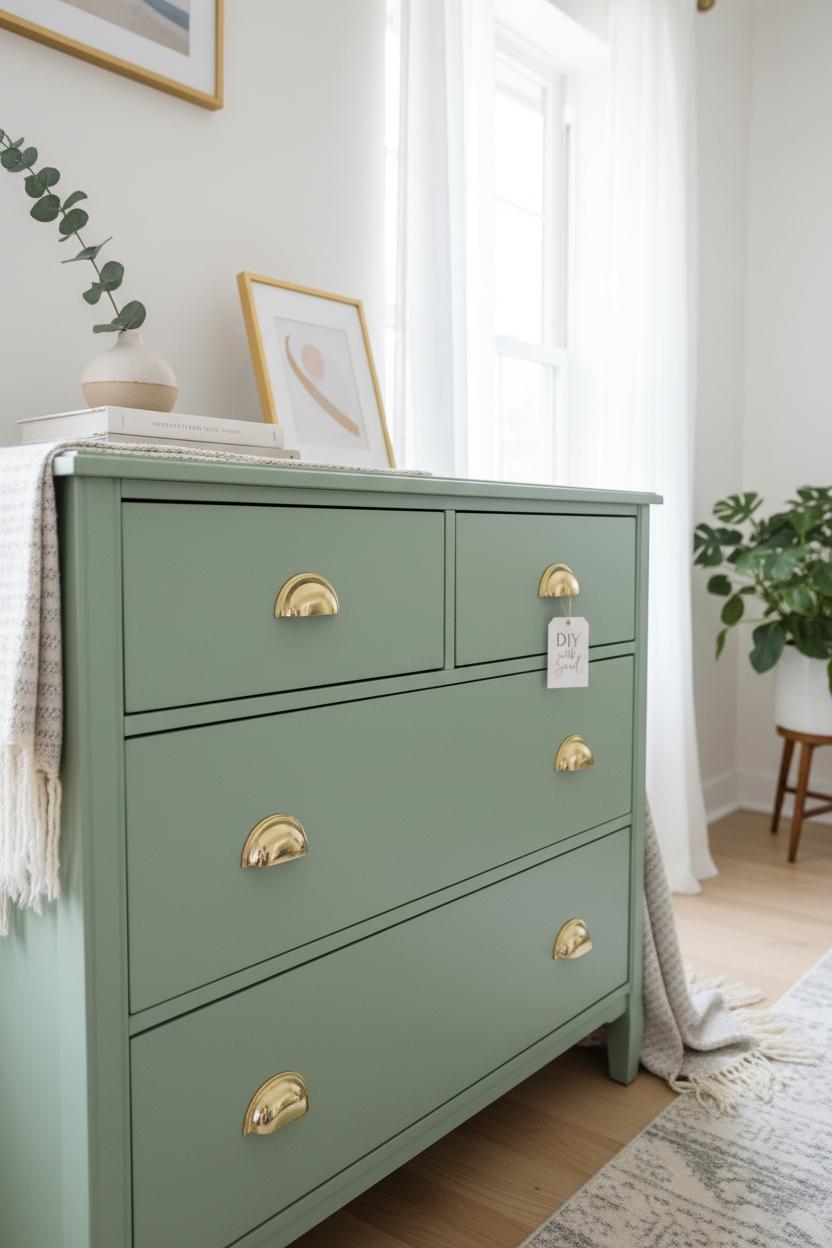 If you’re hunting for sources, I rounded up exact or similar finds so you can recreate this DIY furniture moment. I used a bonding primer to ensure the paint gripped the slick old finish, then a rich, pigment-packed matte furniture paint for coverage that didn’t fight me. A high-density foam roller handled the broad surfaces and left that dreamy matte skin, while a small brush tucked color into the corners. For anyone who loves the ultra-forgiving route, this look is totally achievable with chalk paint too—just seal well if your piece gets heavy use. The satin-bright brass drawer pulls are the secret sauce; they instantly elevate the silhouette and make the whole dresser feel bespoke. Don’t skip a quick once-over with a sanding block between coats for an ultra-smooth final pass. In the after photos you’ll see the finish go from patchy to polished, the profile sharper, and the hardware sparkling—proof that with a few smart supplies and an afternoon, a tired castoff can become the star of your space.