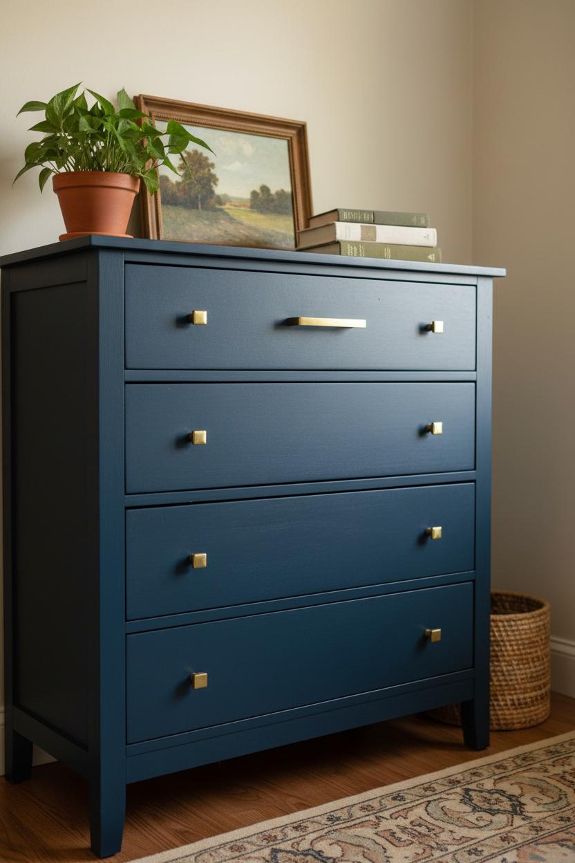 Swipe through the before-and-after photos and you’ll see why I’m still grinning. That shiny orange finish and wobbly knobs were the definition of drab, but a little prep and a lot of patience turned this thrift flip into a chic, collected piece. After a quick scuff with a sanding block and a coat of bonding primer to tame the old varnish, I rolled on a deep inky blue matte furniture paint with a foam roller for that soft, velvety look. The drawers got fresh life with crisp edges, smooth glides, and new brass drawer pulls that glow against the moody color like jewelry. Up close, you can spot the subtle brush-and-roll texture that keeps it feeling handmade, not factory perfect—my favorite kind of character in a dresser makeover. Styled with a leafy plant, a thrifted landscape, and a stack of linen-bound books, the whole vignette now anchors the room and proves a good furniture makeover doesn’t need a big budget, just a little vision and the right tools.
