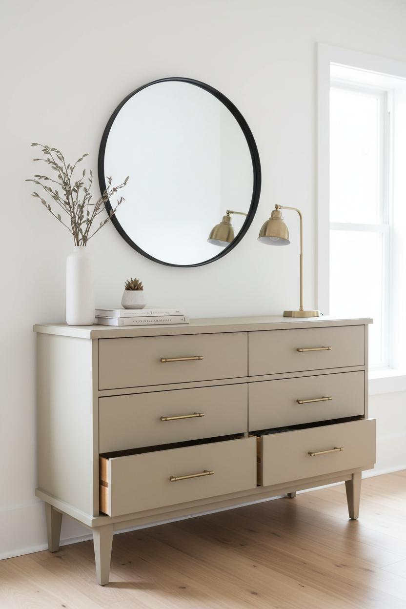 Now for the fun part: dressing her up. After all the sanding block dust settled and the chalk paint cured to that velvety, matte furniture paint finish (applied with a foam roller for a bakery-smooth surface and locked down over bonding primer so there’s no bleed-through), the new brass drawer pulls did most of the heavy lifting in the glow-up. But styling is what transforms a solid dresser makeover into a boutique-worthy centerpiece. I like to start with a statement anchor: a tall arched mirror or a large piece of art hung just a few inches above the top so the dresser feels intentional, not floating. From there, create a gentle triangle with height—lamp on one side, a stack of coffee table books on the other—so the eye moves. Tuck a small bowl on the books for keys and a candle snuffer, then soften the whole vignette with something alive: a trailing pothos or a sculptural branch in a textured vase.
