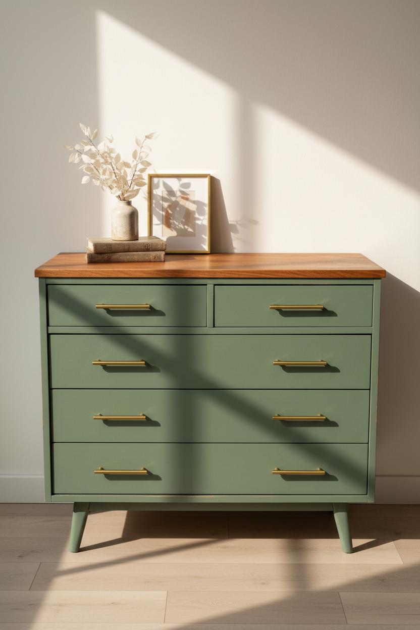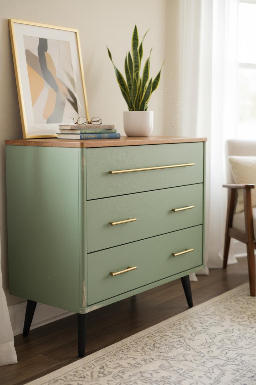 I love pairing a natural wood top with a painted body for contrast, and chalk paint makes it wonderfully foolproof. Layer two soft tones and lightly distress the edges to hint at age, or keep it modern with a velvety, solid finish. A petite side table that once felt too squat? Add sleek, tapered furniture legs for height and presence, then finish with a deep walnut wood stain and clean, mid-century pulls. The transformation is all about details: softened corners, updated hardware, and a finish that suits your space. Imagine the before—yellowed varnish, sticky drawers, clunky feet—and the after: a matte sage green base, warm stained top, and gleaming pulls catching morning light beside a stack of books. That’s upcycled furniture doing its glamorous thing.
