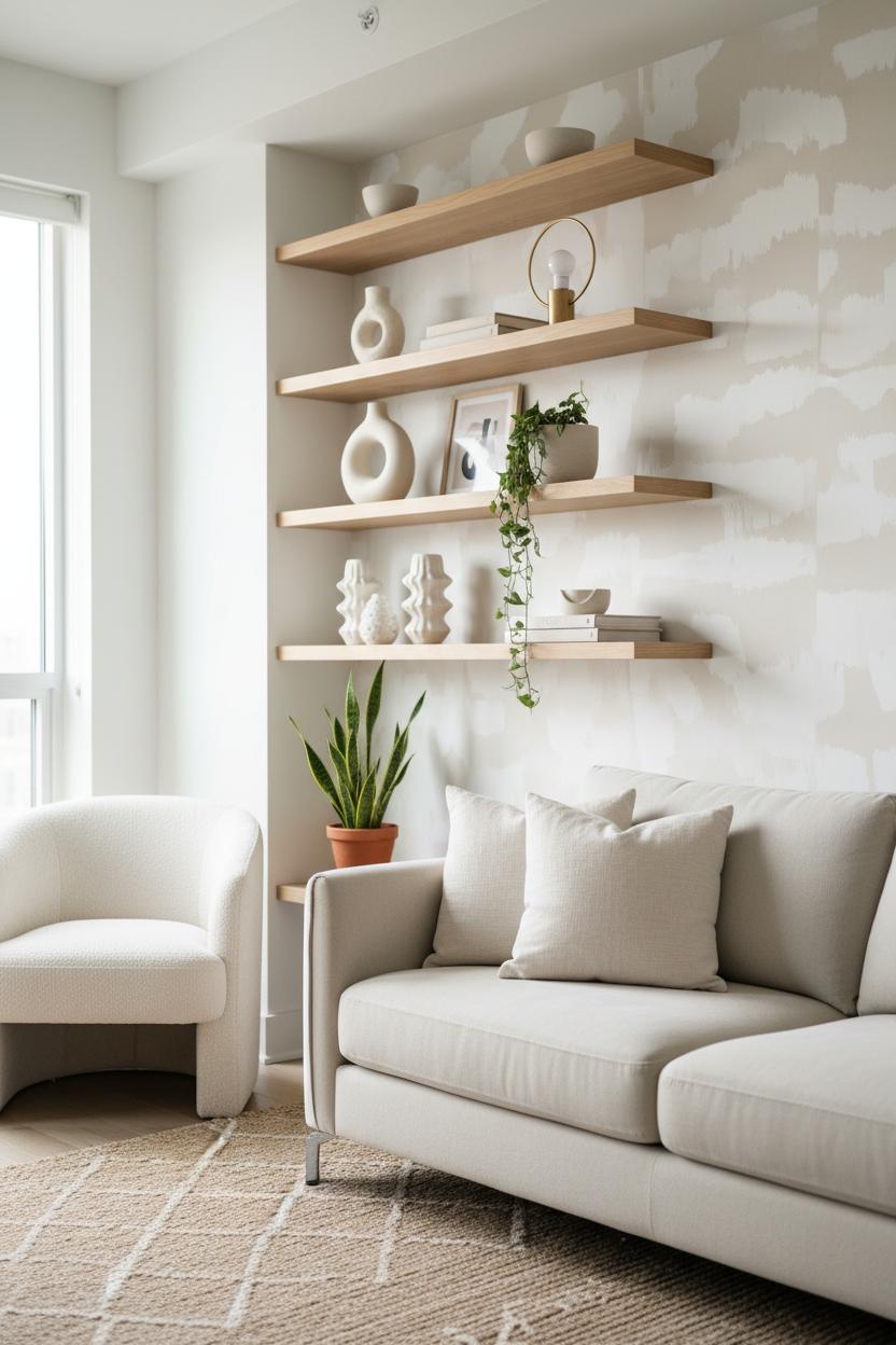Renter-friendly installation is totally doable. Look for lightweight floating shelves designed for drywall with removable anchors, or try picture-ledge styles that require minimal, patchable holes—always check your lease and weight limits. If your walls are no-drill only, create the same effect with a narrow leaning shelf unit and style it like a floating moment. To tie the scene together, layer in details you can swap seasonally: a pair of neutral throw pillows on the sofa to echo your shelf palette, a boucle accent chair tucked beneath for a textural reading nook, and a soft area rug 5×7 to define the zone without overwhelming it. A strip of peel and stick wall art behind the shelves adds a subtle backdrop that feels custom but peels off cleanly when it’s time to move.