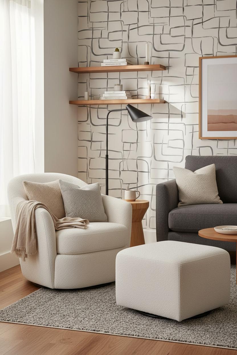 Go vertical to free the footprint. Floating shelves above a sofa or entry bench create a light, renter friendly landing zone for keys, art, and books without bulky furniture. If your layout allows, tuck a petite boucle accent chair into a window corner and turn it into a reading nook; a slim floor lamp and small side table transform it into a micro-lounge that doesn’t crowd the room. When you want personality without commitment, peel and stick wall art is a quick win—use a bold botanical or geometric to frame a “zone” visually, or run a soft stripe up the wall to draw the eye higher. Lighting is your secret space-maker: plug-in sconces free up tabletops, and warm bulbs instantly soften the vibe.