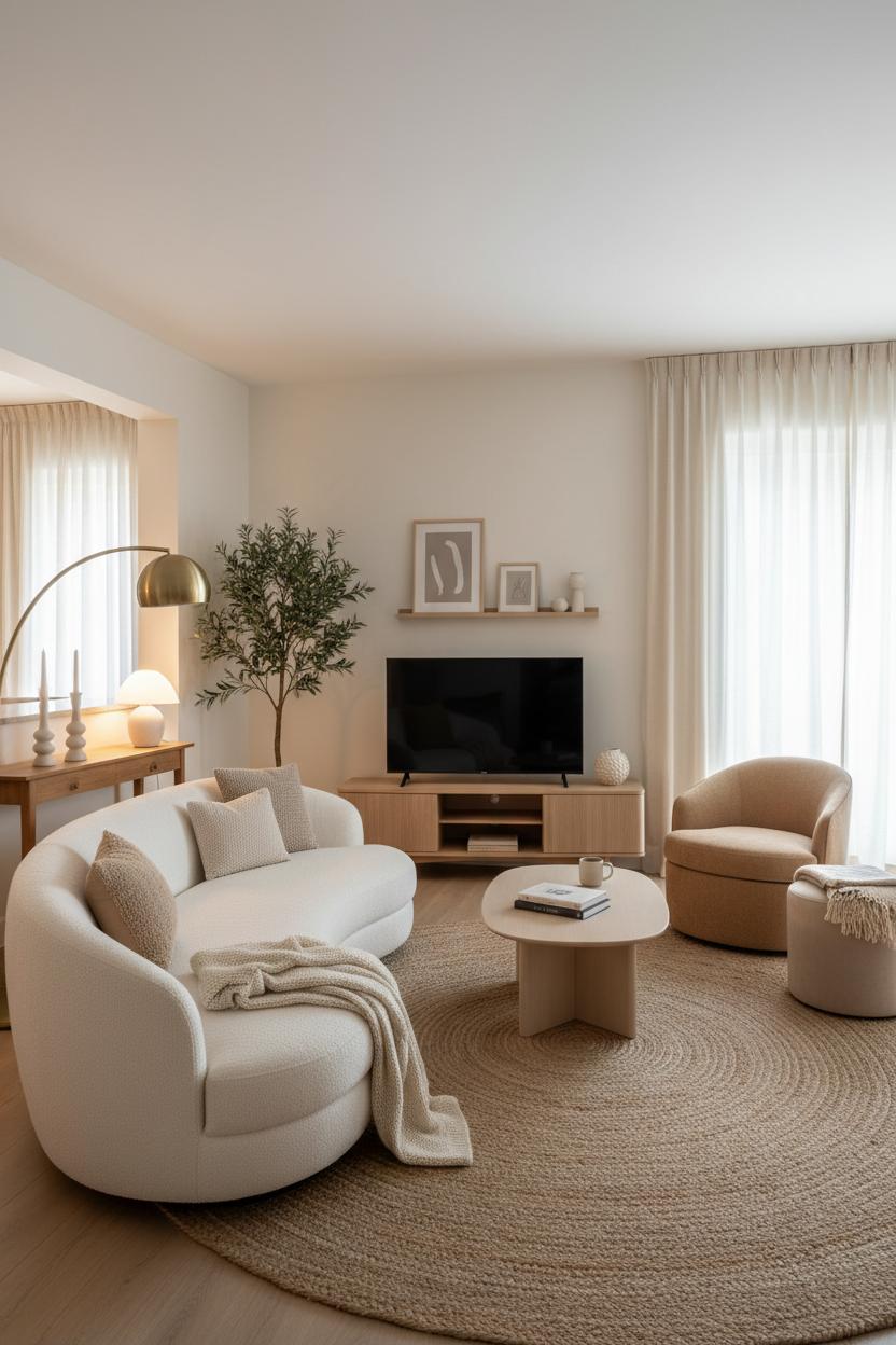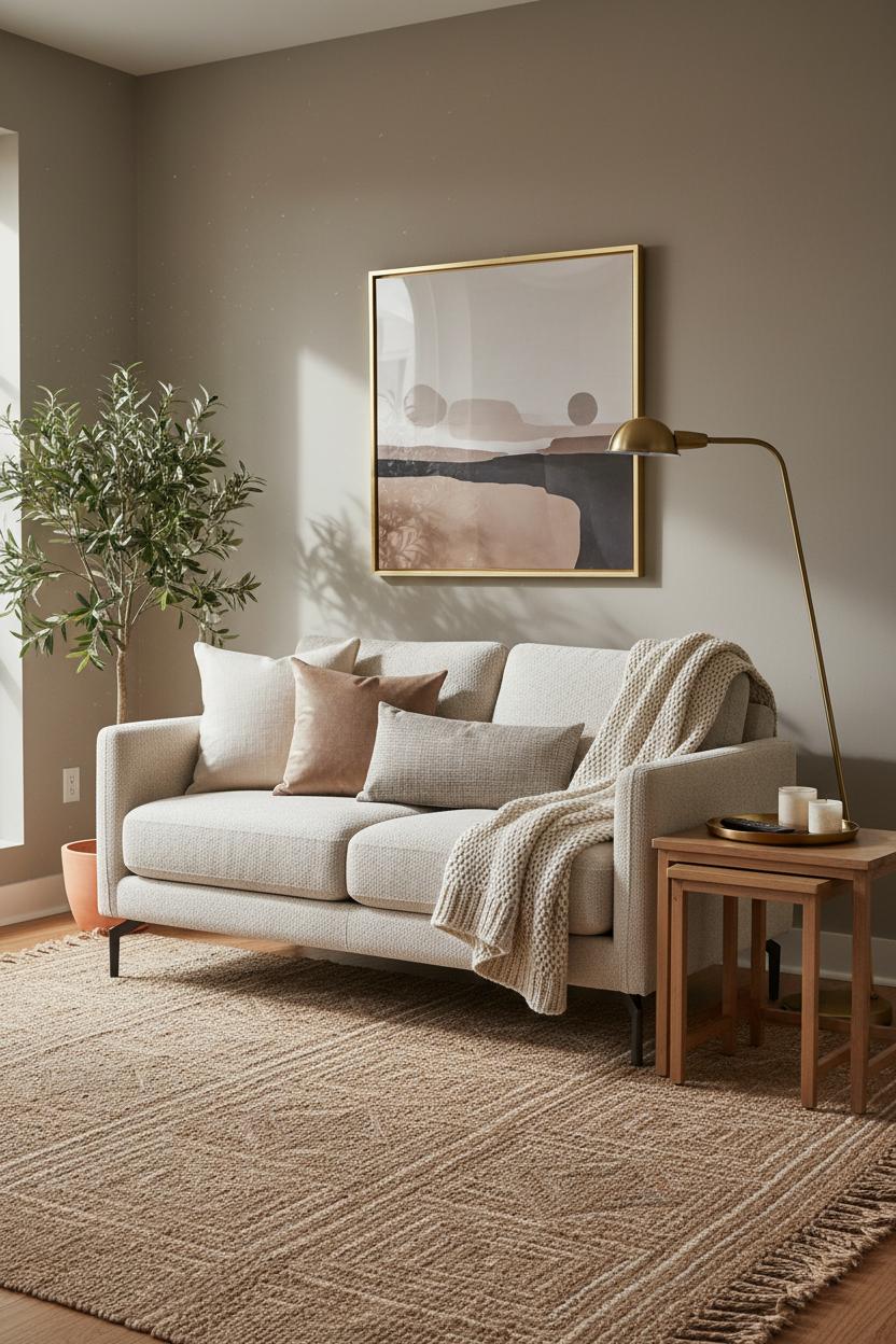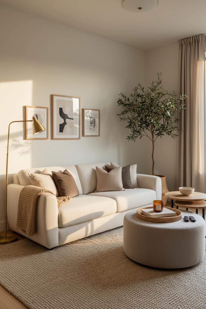 To round out the vignette, let the rest of the room echo those layered neutrals. A woven area rug underfoot sets a tactile foundation, a brass floor lamp washes everything in a mellow glow at dusk, and an olive tree faux plant lends a soft, organic green that makes the sand and stone hues feel richer. Repeat each tone at least three times across the space—on pillows, a throw, and artwork—so the palette feels intentional, not matchy. This is neutral interior design that’s anything but flat: quietly luxurious, endlessly cozy, and perfectly tuned to a modern cozy living room.