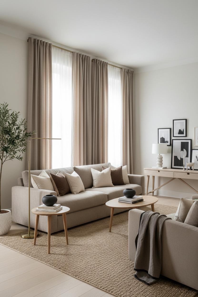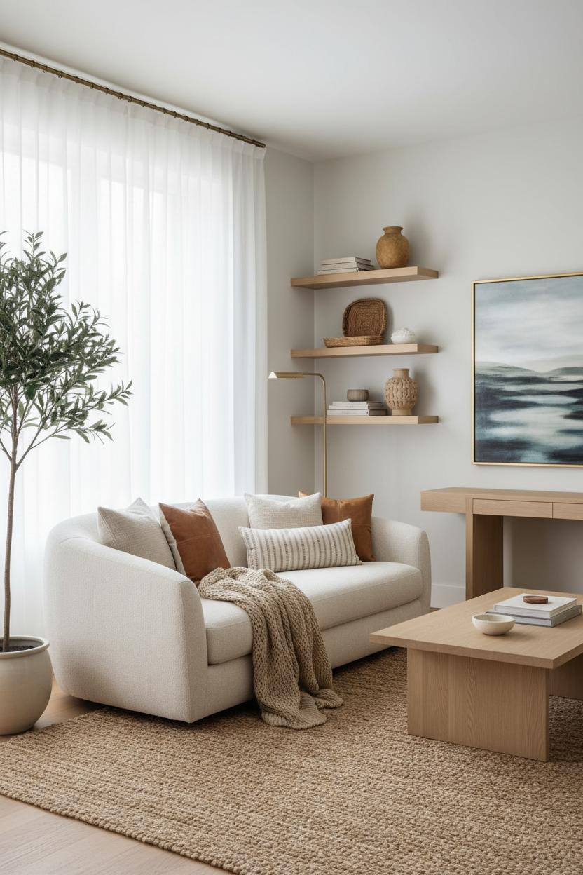 Texture is your best friend in neutral interior design, so pile on neutral throw pillows in linen, nubby boucle, and soft leather, mixing solids with a subtle stripe or micro-check for just a whisper of pattern. A chunky knit throw tossed casually over the arm keeps things relaxed. On the walls, choose an oversized landscape or abstract in desaturated tones; add a thin brass or black frame to tie back to the lamp. If you’re tight on square footage, lean into small space ideas: opt for nesting tables instead of a giant coffee table, use a storage ottoman for extra blankets, and mount shelves higher to draw the eye up. Sheer, ceiling-mounted curtains elongate the room and diffuse daylight—one of my favorite home styling tips for making a petite space feel serene and airy.