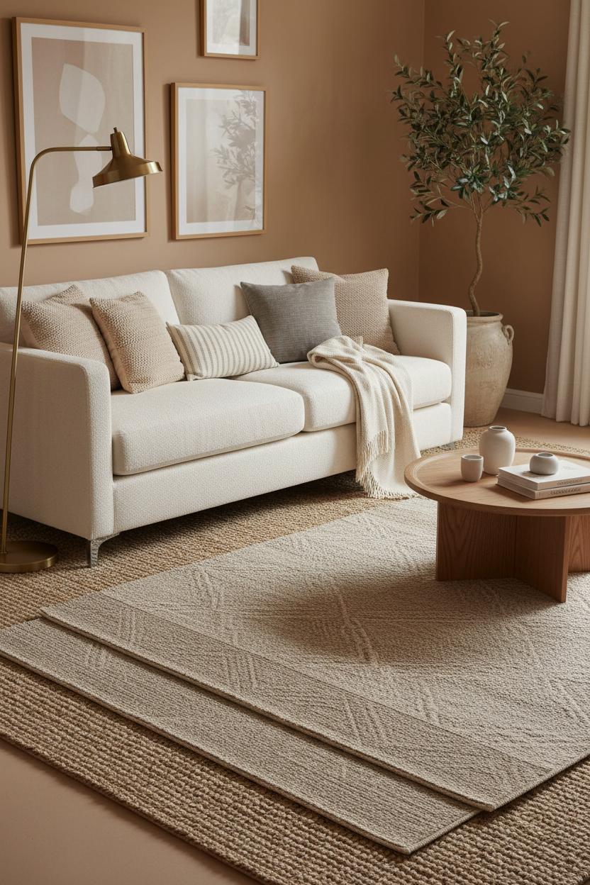 Start from the ground up and everything else suddenly falls into place. A woven area rug is the quiet hero of a modern cozy living room, adding instant warmth, sound softening, and that layered look we all pin to our dream home decor boards. I love a palette of oatmeal, sand, and mushroom—neutrals that feel sun-warmed rather than cold—so the rug reads as texture, not “pattern.” Picture a nubby natural-fiber foundation with a soft wool flatweave on top, edges peeking out like a cuffed sleeve. Set a creamy boucle sofa over it, tuck in neutral throw pillows, and let a brass floor lamp pool light across the weave. A tall olive tree faux plant in the corner brings a whisper of green without stealing the calm. This is neutral interior design at its coziest: restful, tactile, and quietly elevated.