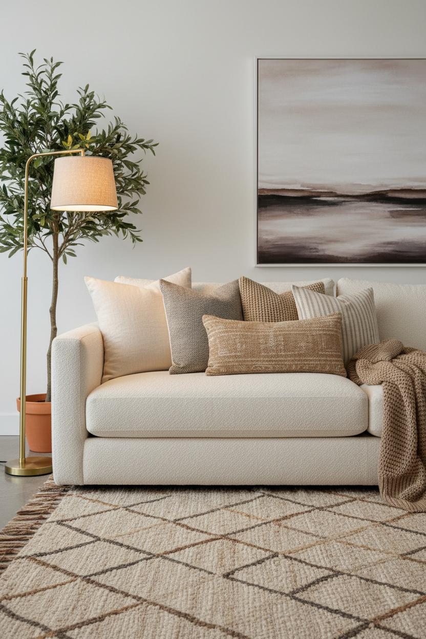 Layering is where comfort blossoms. A neutral interior design palette—oatmeal, warm white, sandy taupe—sets a calming backdrop, while texture brings the cozy. Mix nubby neutral throw pillows with a knitted throw and a linen accent to balance the plushness of the boucle. Add a brass floor lamp beside the sofa for a soft, glowy pool of light, then pair it with a petite table lamp on the console and a candle or two for those moody evenings. A tall olive tree faux plant in the corner adds height and a whisper of green without demanding sunlight or watering schedules. These small, intentional choices are the home styling tips that make the room feel both elevated and lived-in, like a sanctuary you can actually sink into.