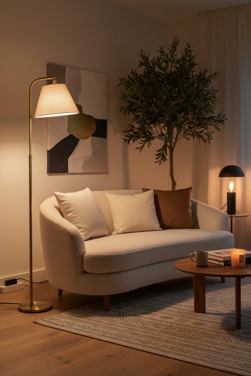 Next, go for slender silhouettes that keep sightlines open. Look for raised legs, narrow arms, and airy bases so light can travel underneath. A compact boucle sofa with a tight bench seat feels plush yet visually lightweight, especially topped with neutral throw pillows in mixed textures. Pair it with a brass floor lamp for a warm, vertical glow that doesn’t eat up tabletop space. Stick to a neutral interior design palette and layer texture—boucle, linen, soft knits, matte ceramics—so the room reads calm but never flat. If you crave a pop of life, an olive tree faux plant adds height and a soft, Mediterranean note without the maintenance.