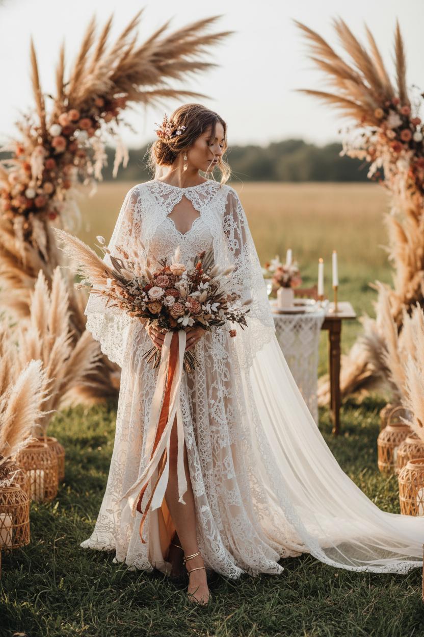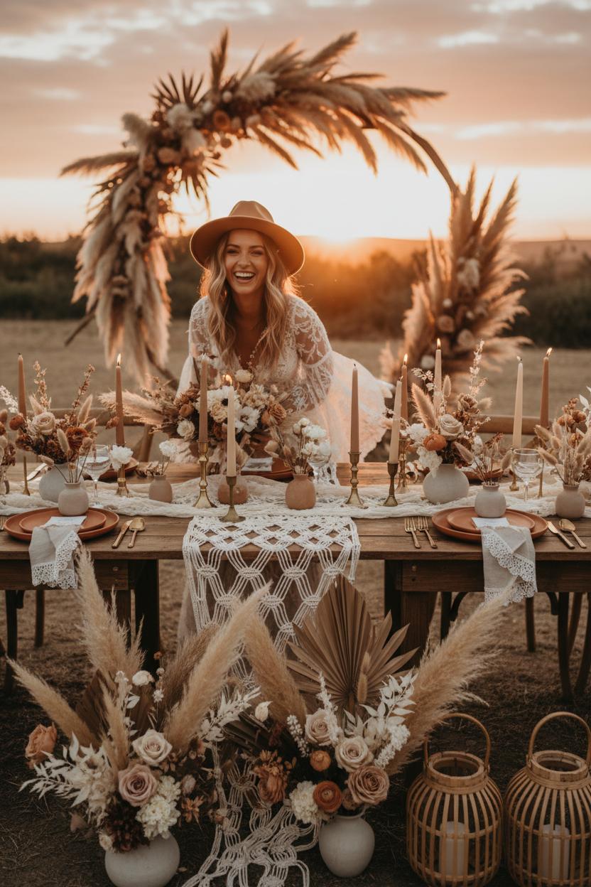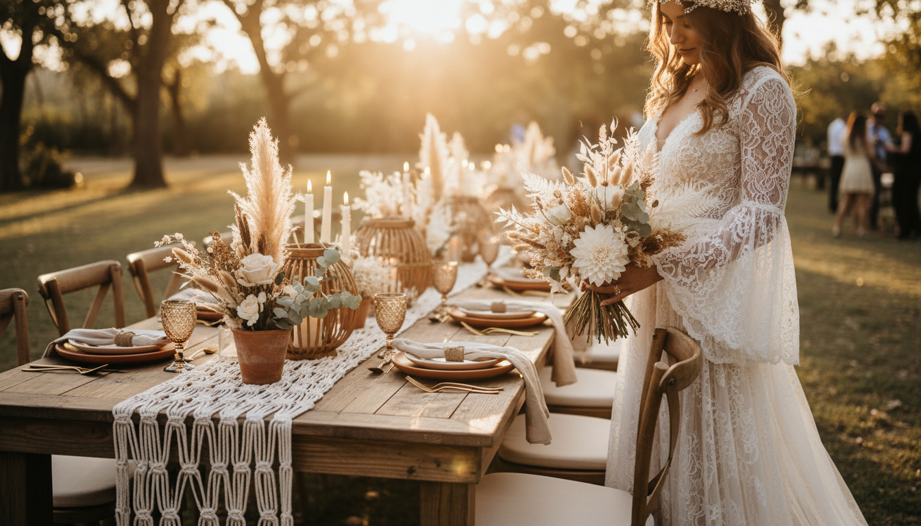 Float into a dreamy boho wedding where dried florals and lace steal the spotlight. From bohemian wedding decor layered with a macrame table runner and rattan lanterns to pampas grass decor framing your aisle, discover boho bridal ideas that feel effortless and romantic. Imagine a pampas grass wedding with airy dried floral arrangements, a hand-tied dried flower bouquet, and the glow of taper candles at sunset. This guide curates textures, tones, and tips to style your day with soulful details and modern whimsy.
