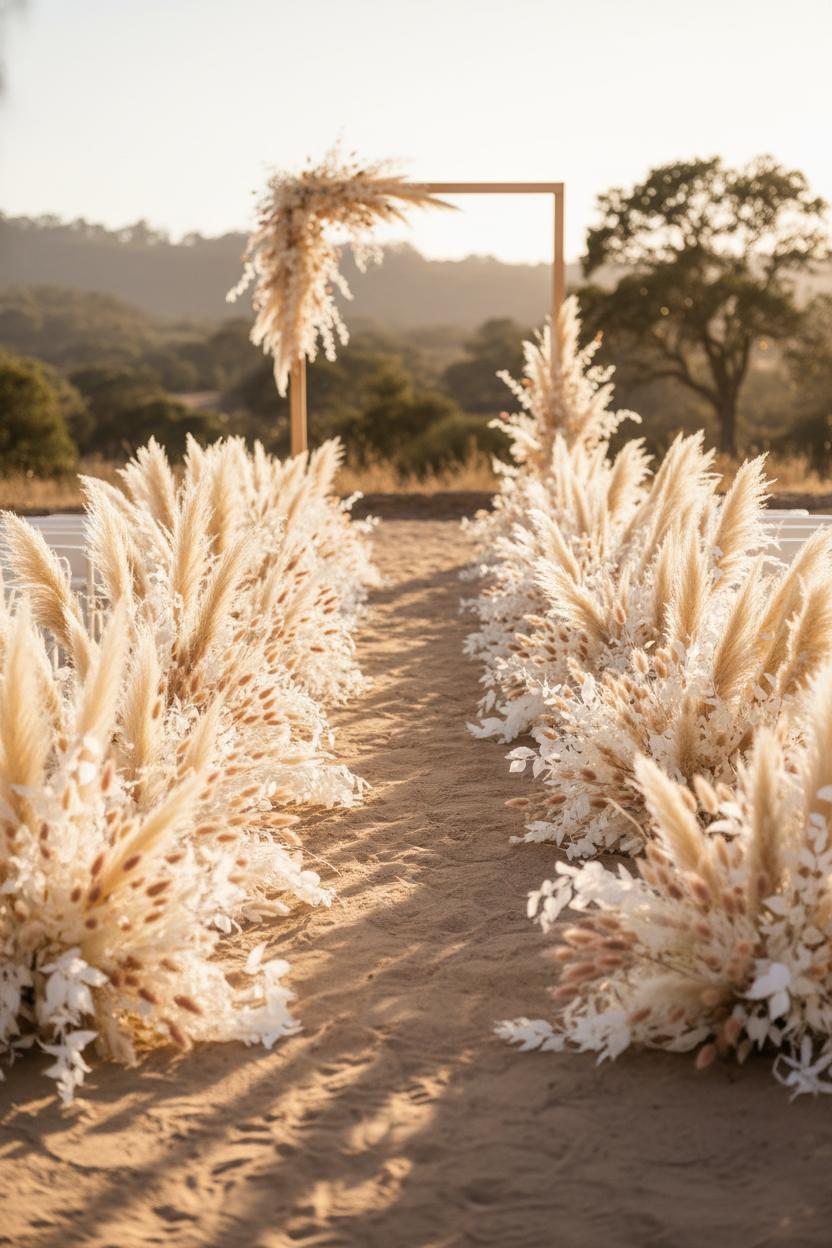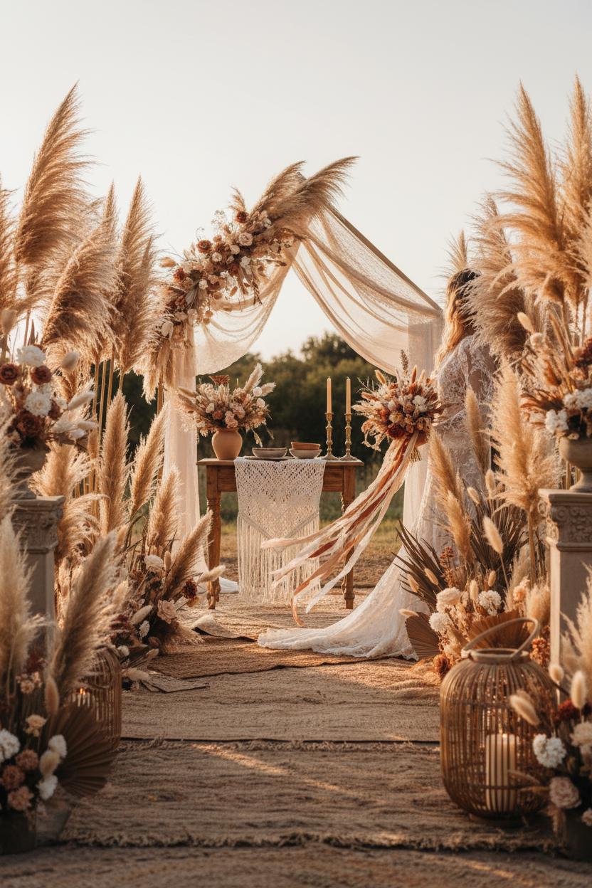 Imagine your guests arriving to a hush of soft neutrals and texture-on-texture goodness—the kind of ceremony space that feels like stepping into a dream. For a pampas grass wedding, start with sculptural plumes framing the aisle, their feathery tops catching the light and swaying with the breeze. Layer in clusters of pampas grass decor at varying heights to create a natural “meadow” effect, then weave in dried floral arrangements—think bleached ruscus, bunny tails, palm spears, and airy lunaria—to add whispery movement and depth. An asymmetrical arch wrapped in lace and trailing ribbons keeps the look effortlessly undone, while a macrame table runner draped over the signing table or altar brings that handcrafted, bohemian wedding decor touch. Ground everything with textural rugs and ceramics, and set the mood with rattan lanterns down the aisle paired with warm, flickering taper candles in brass holders for that golden-hour glow even if the sun plays coy.