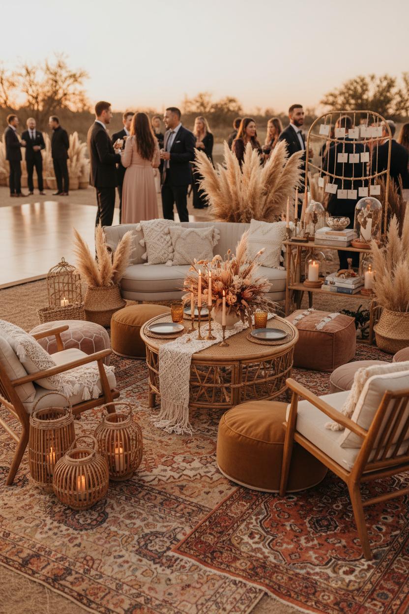 Imagine guests drifting from the ceremony into a cozy lounge that feels like a desert sunset—soft, layered, and totally effortless. Build your scene with a mix of textures: low rattan coffee tables, cane-back chairs, and velvet poufs anchored by overlapping vintage rugs in sand, rust, and blush. Add lace-edged throws and embroidered pillows to echo the ethereal mood of the day, then weave in greenery for a hint of life among the neutrals. This is where bohemian wedding decor really shines: it’s all about combining woven details, earthy ceramics, and organic shapes so the space looks collected, not contrived. If you’re dreaming of a pampas grass wedding, tuck feathery plumes behind lounge seating and let them frame the vignette like a natural backdrop—suddenly your reception feels like a private oasis in the middle of the party.