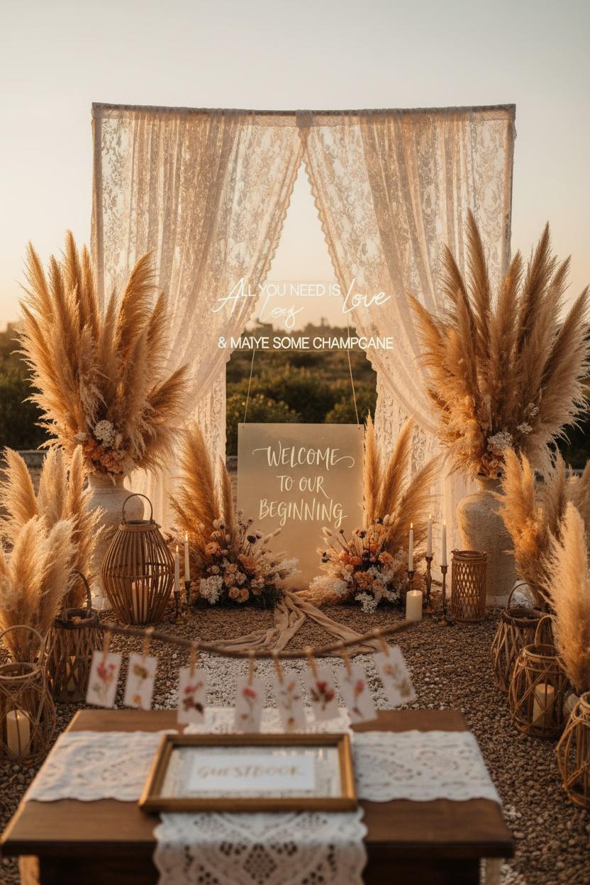 Keep the visual language cohesive by carrying those rustic details into your seating chart, bar menu, and guestbook table. A macrame table runner under your signage adds a touch of handmade charm, while a lace overlay or doily-edged frame nods to heirloom romance. Consider a layered backdrop for the main photo moment: lace drapes, a salvaged door, and a swath of pampas grass wedding plumes anchored in ceramic urns—then add a cheeky neon phrase to modernize the look. For escort cards, press names over dried floral arrangements or suspend tags from a branch wrapped in twine; it’s one of those easy boho bridal ideas that looks bespoke. Repurpose ceremony aisle bundles of pampas grass decor to style the photobooth corners, and place rattan lanterns along pathways so guests naturally discover each setup. The key is repetition and texture—neutral tones, mixed heights, and a little bit of movement—to keep every sign and snapshot cohesive and romantic. With the right layers of lace, dried blooms, and candlelit accents, your signage turns from informational to unforgettable, and every corner becomes a keepsake moment in your boho wedding gallery.