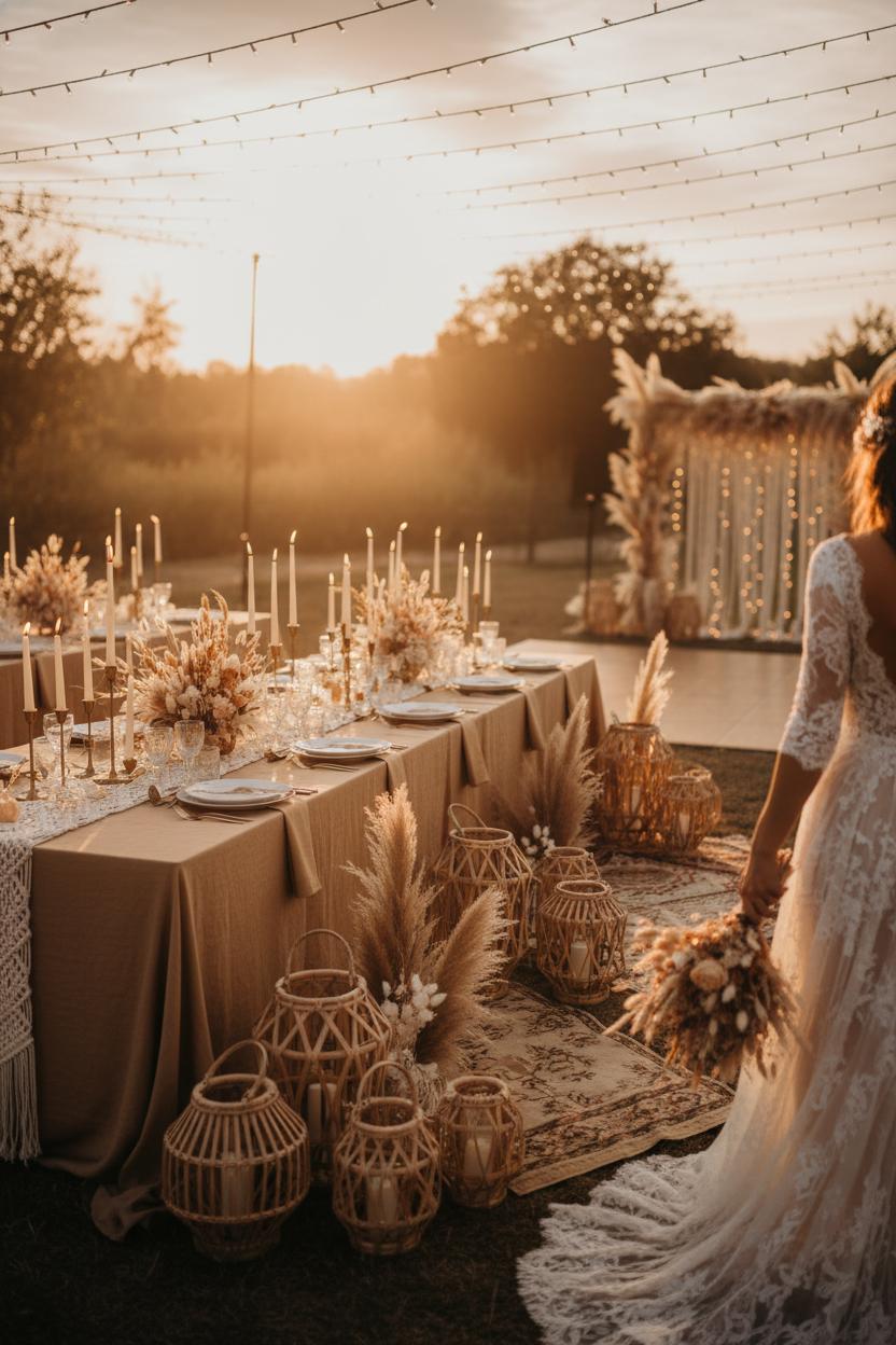 As the sun slips low and the sky turns that soft peachy-gold, the magic of your boho wedding really comes alive. Golden Hour light loves texture, and nothing shows it off better than a gentle mix of taper candles, twinkling fairy lights, and woven rattan lanterns. Picture the lace of your gown catching the glow, your dried flower bouquet taking on warm honeyed tones, and the shadows of your decor softly dancing as the day melts into evening. This is where bohemian wedding decor meets pure romance—layered lighting that feels effortless and intimate, like the last page of a summer novel you never want to end.