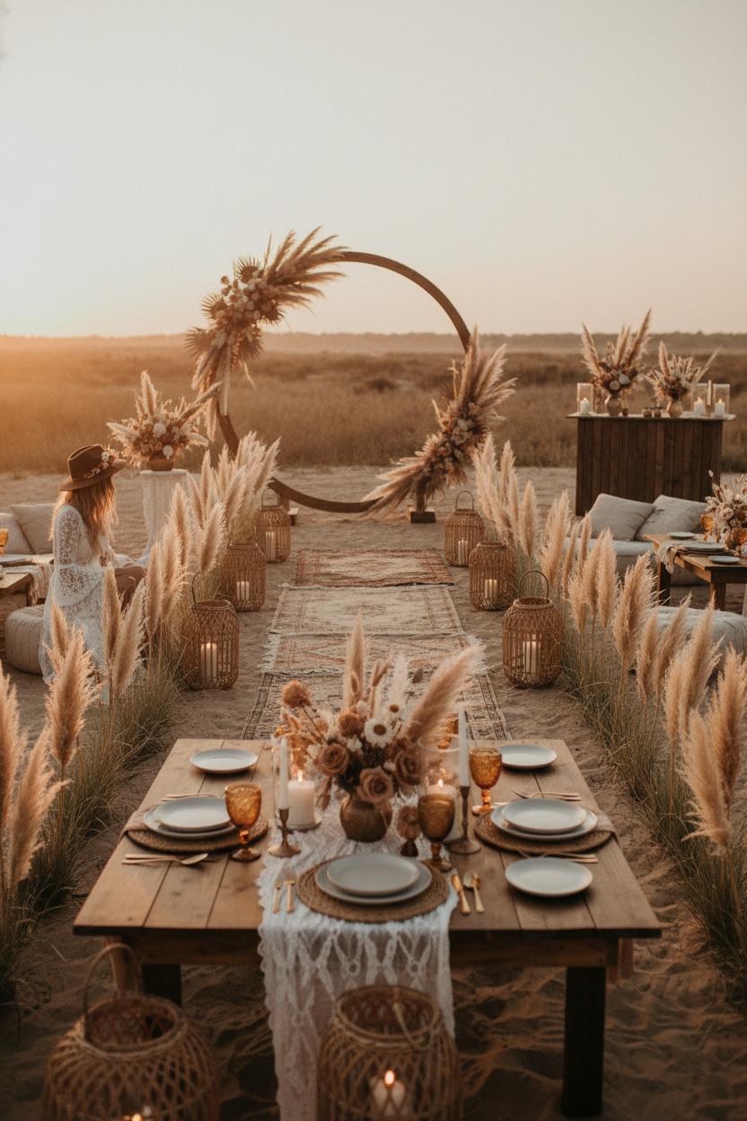 Picture your venue washed in sun-faded neutrals and soft textures, where lace catches the breeze and everything feels a little golden at the edges. Start with a palette of sand, clay, and blush, then build the mood with layers: a macrame table runner over raw wood, vintage rugs underfoot, and airy pampas grass decor swaying along the aisle. For the ceremony, think a sculptural arch or hoop framed with dried palm spears, bunny tails, and bleached ruscus, accented by a dried flower bouquet that feels effortless and wild. Scatter rattan lanterns down the walkway and tuck taper candles into hurricane vases for a warm, whispery glow that lingers into twilight. The result is the quintessential boho wedding scene—romantic, undone in the best way, and perfect for a pampas grass wedding that photographs like a dream.