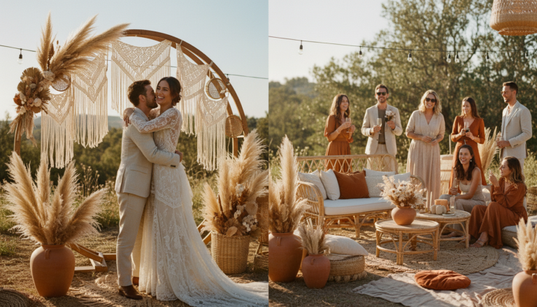 Float into a dreamy boho wedding where dried florals and lace steal the spotlight. From bohemian wedding decor layered with a macrame table runner and rattan lanterns to pampas grass decor framing your aisle, discover boho bridal ideas that feel effortless and romantic. Imagine a pampas grass wedding with airy dried floral arrangements, a hand-tied dried flower bouquet, and the glow of taper candles at sunset. This guide curates textures, tones, and tips to style your day with soulful details and modern whimsy.