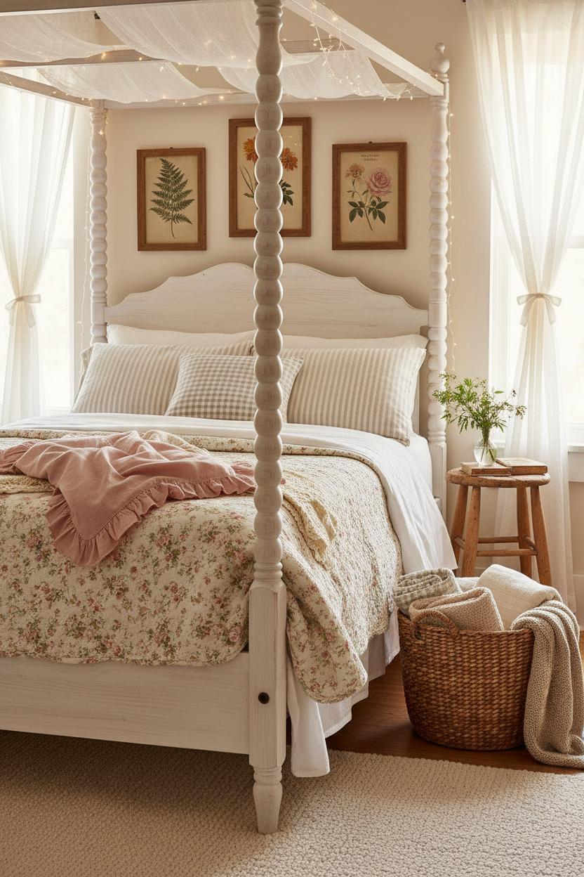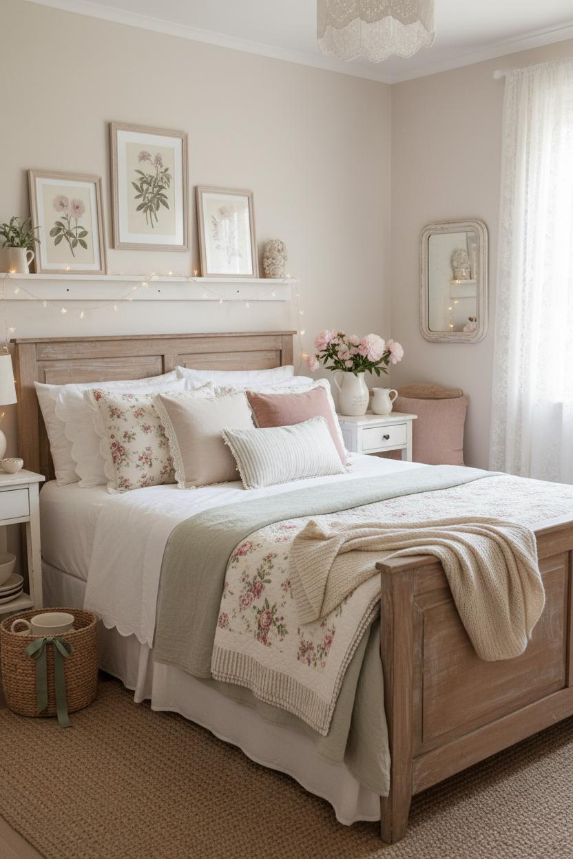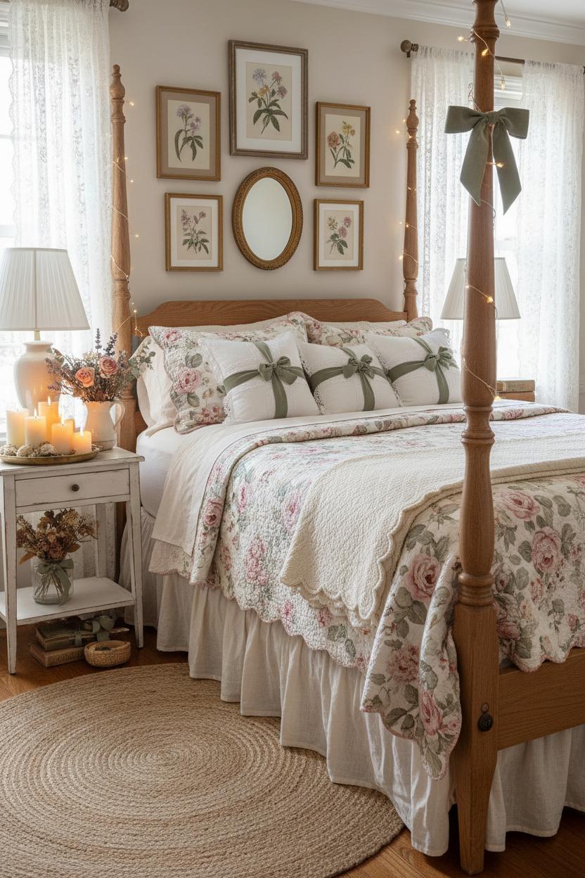 When it comes to finishing touches, curate a few pretty layers that tell your own cottage story. A cluster of botanical wall art above the headboard brings the garden indoors, and a scatter of linen and velvet pillows keeps the bed inviting without overwhelming the room. For that romantic bedroom aesthetic, string fairy string lights around the canopy or along a shelf—soft, golden pinpricks that make everything feel dreamy after sunset. A braided jute rug underfoot, a ceramic jug as a bedside vase, and a vintage-style mirror with a gentle patina all whisper rather than shout, keeping the room calm and collected. Let your palette repeat softly around the space: a blush throw on a chair, sage ribbon tied to a basket, creamy ceramics on the nightstand. The magic is in the layering—textiles that look heirloom-loved, hues that feel like faded wildflowers, and small details that make you exhale when you walk in. With these textures and tones, your bedroom becomes a tender retreat, a lived-in love letter to cottage comfort that blends vintage farmhouse style with effortless, shabby chic decor charm.