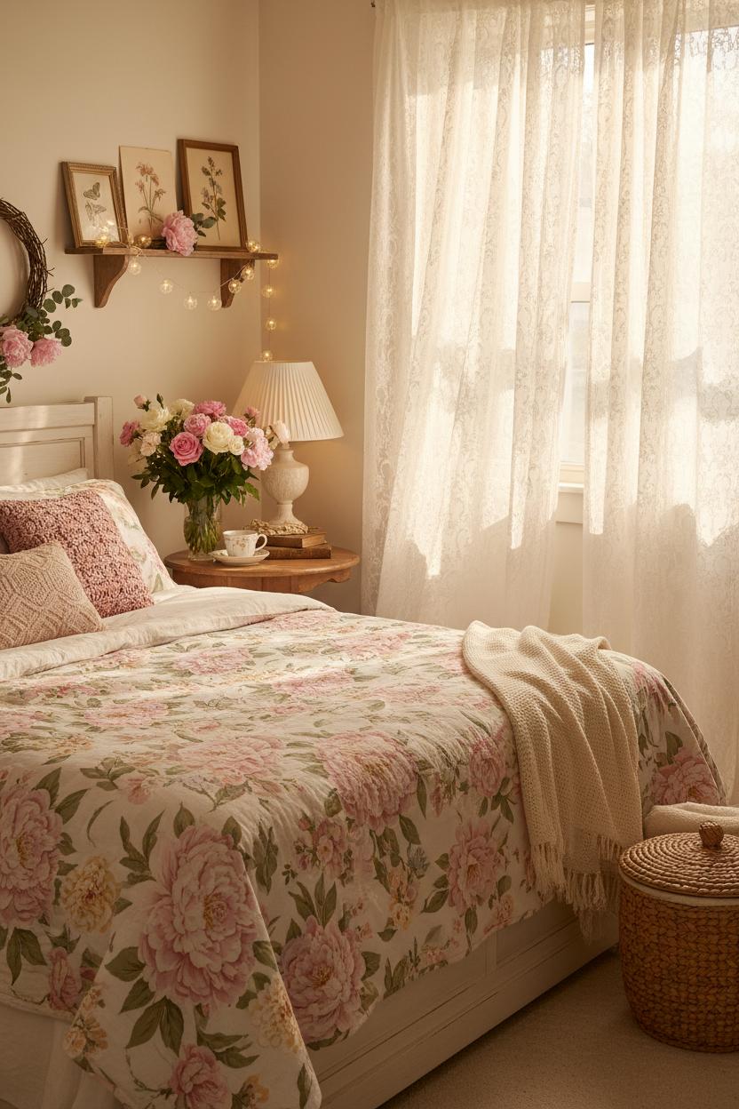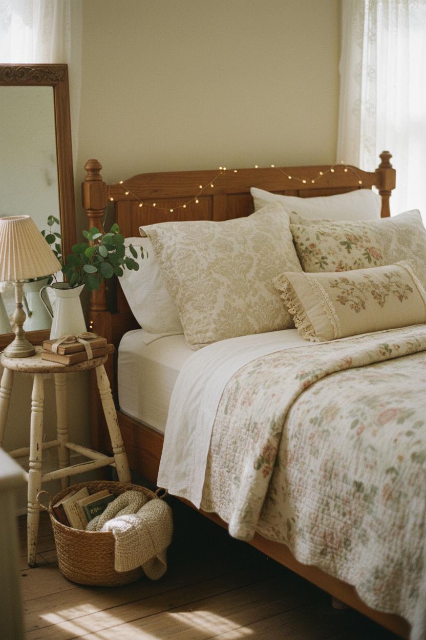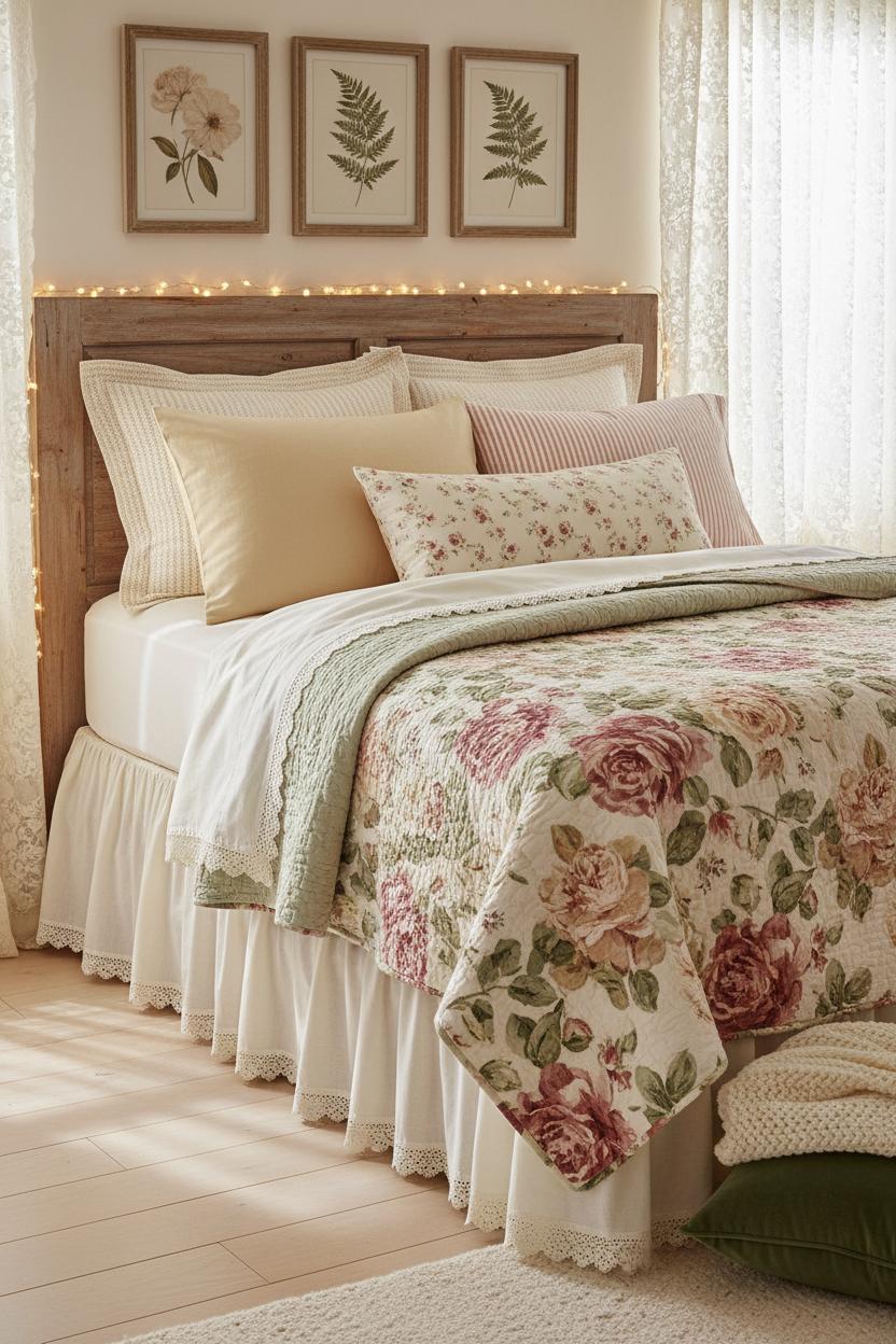 For finishing touches, think of the bed as your bouquet and the room as its garden. Lace curtains filter the morning light into a gentle glow, and a strand of fairy string lights draped along the headboard makes every evening feel like golden hour. Above the bed, a trio of botanical wall art prints echoes the quilt’s blooms without competing, tying the whole story together. Keep a folded knit throw at the foot for chilly nights and swap in a velvet pillow come autumn—easy seasonal shifts are the secret sauce of cottagecore bedroom ideas. If you love fullness, size up your inserts so pillows stand tall, and choose a quilt with a generous drop to showcase that gorgeous drape over the sides. Layered bedding is all about contrast: crisp percale against puffed quilting, delicate ruffles beside timeworn wood, new finds nestled with heirloom pieces. Gather, mix, and tuck until it feels right—lived-in, lovely, and perfectly you.