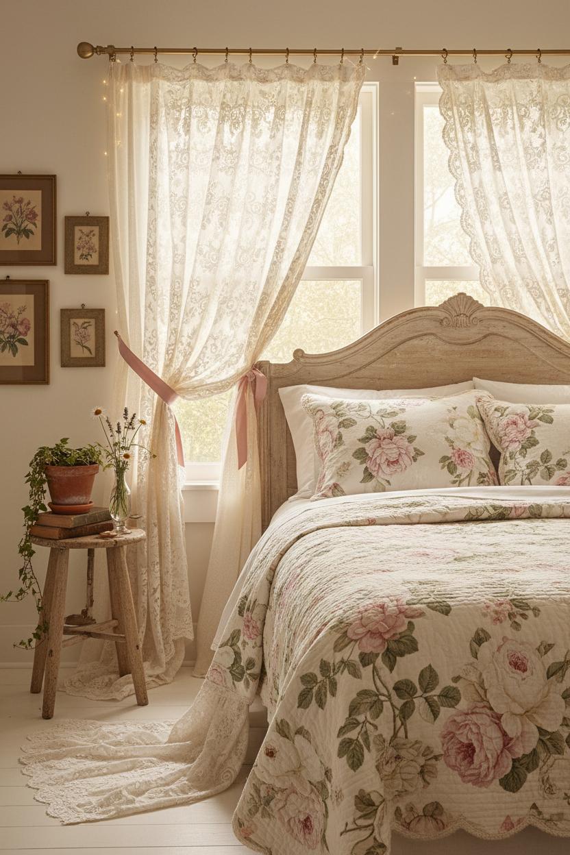 There’s something about the way morning light sifts through lace curtains that instantly softens a room and whispers old-world romance. Hung high and wide, they make even petite cottage windows feel grand and airy, filtering sunshine into a hazy glow while still offering a bit of privacy. Opt for delicate floral or scalloped patterns and let the hem gently puddle; it’s the easiest way to get that vintage farmhouse style without trying too hard. I love the interplay of shadow and pattern they cast across a wooden bed frame and a floral quilt queen, like dappled light in a garden. For a romantic bedroom aesthetic, keep the palette creamy and timeworn—tea-stained ivory, soft blush, and weathered wood—then echo the motifs with botanical wall art clustered above the headboard. The whole look sits right at the intersection of cottagecore bedroom ideas and shabby chic decor, inviting you to slow down and breathe in the quiet.