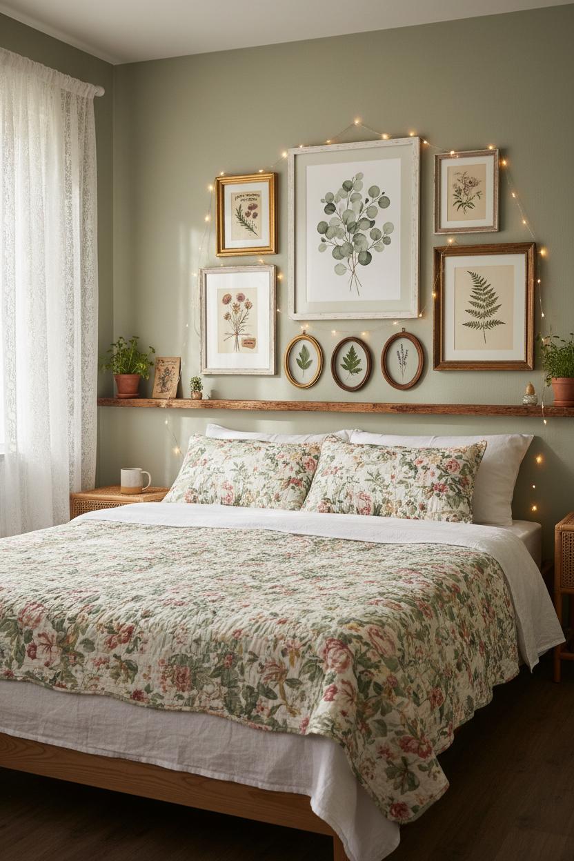 When evening falls, drape fairy string lights around the gallery or along a ledge shelf to add a twinkly glow that enhances the romantic bedroom aesthetic. Let a few pieces rotate with the seasons—pressed ferns in spring, strawflower bundles in autumn—so your space always feels alive. Keep some breathing room between frames so the arrangement stays restful, and let natural textures—linen, rattan, unfinished wood—do the talking. With a thoughtful mix of artwork and heirloom vibes, your botanical wall becomes the heart of the room, wrapping every morning and night in the gentle hush of a country garden.