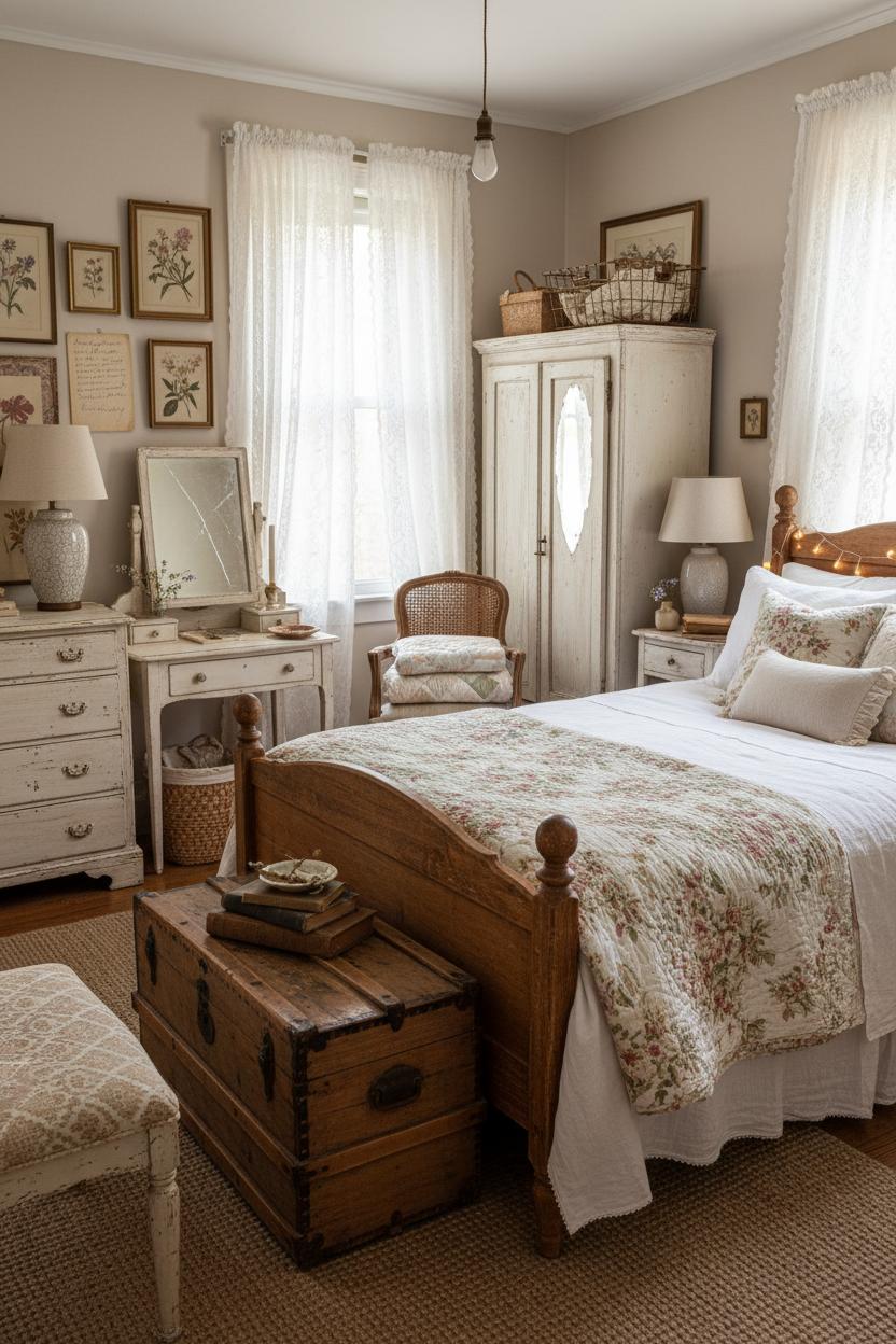 There’s something magical about letting your space evolve through pieces you’ve rescued and reimagined. Start by combing thrift shops and flea markets for items with character: a timeworn stool that can become a nightstand, a stack of antique books tied with ribbon, a carved mirror with foxed glass. These little treasures bring instant soul and lean into that vintage farmhouse style we all swoon over. If you find a scuffed dresser or trunk, try a quick sand and a coat of creamy chalk paint, then distress the edges for soft, imperfect charm—pure shabby chic decor. Anchor the room with a sturdy wooden bed frame and layer textures like a floral quilt queen over crisp linen sheets, finishing with mismatched pillows for that collected-over-time look. This is the heart of practical cottagecore bedroom ideas: letting patina and personality do the heavy lifting.