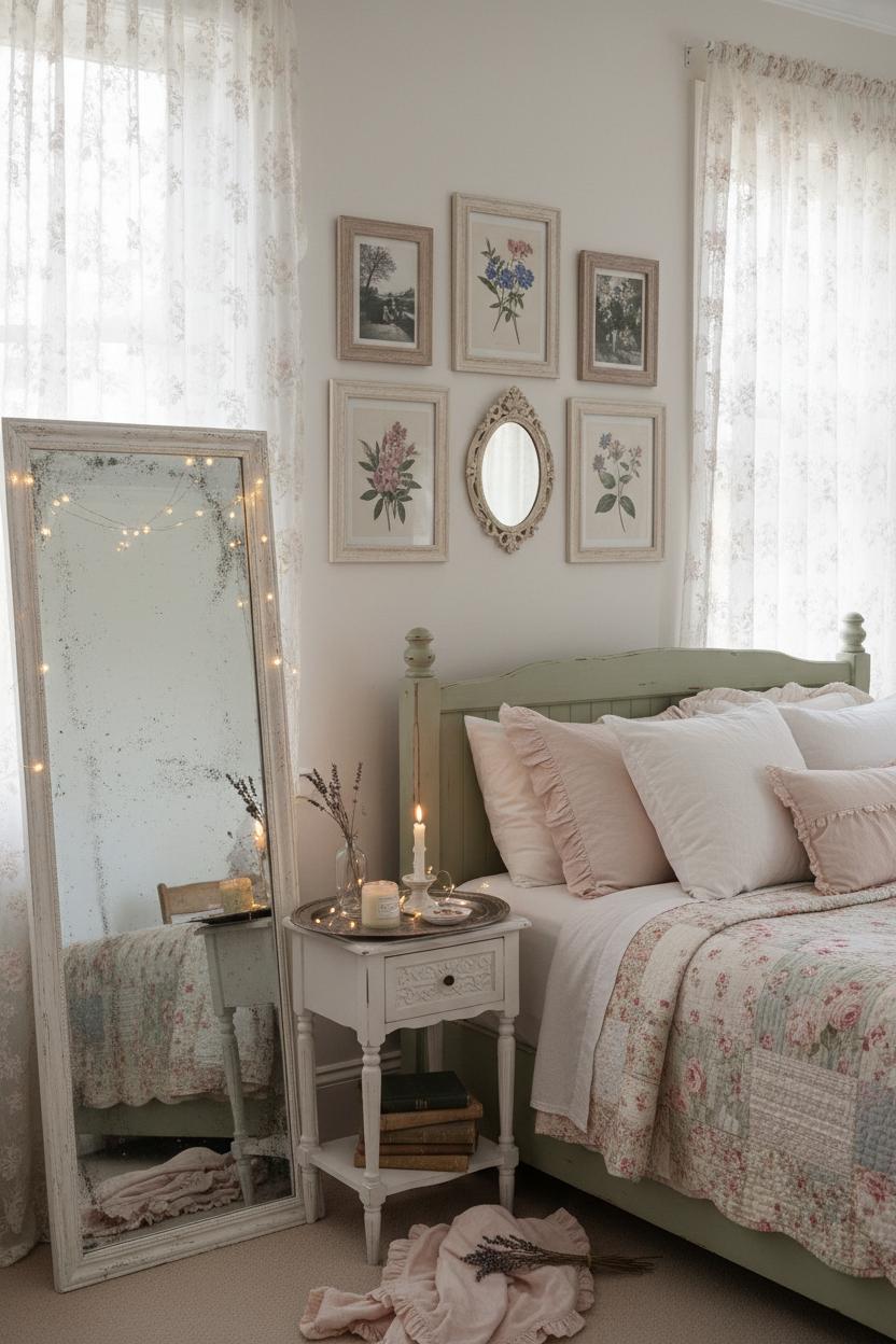 On your dresser or nightstand, a timeworn tray becomes a little stage for everyday beauty. Look for chipped enamel, carved wood with a whitewash finish, or a thrifted silver platter with a soft tarnish. Layer it with a candle, a tiny bud vase, a ceramic dish for rings, and a stack of well-loved books; suddenly, routine feels poetic. Nearby, mismatched frames pull everything together. Collect ornate and simple silhouettes in creamy whites and dusty pastels, then fill them with vintage photos, pressed blooms, or botanical wall art to echo garden romance indoors. A mini gallery above your vanity or reading nook brings texture and memory into the mix, perfect for those cottagecore bedroom ideas that prioritize soul over perfection. Between the frames, mirrors, and trays, you get the best of vintage farmhouse style and cozy bedroom decor without clutter—just curated softness. And if you’re layering in more accents—like a ruffle-edged throw, a sprig of lavender on the tray, or fairy string lights woven around a mirror—each detail nudges the room deeper into shabby chic decor bliss, a space that feels tender and timeworn in all the right ways.